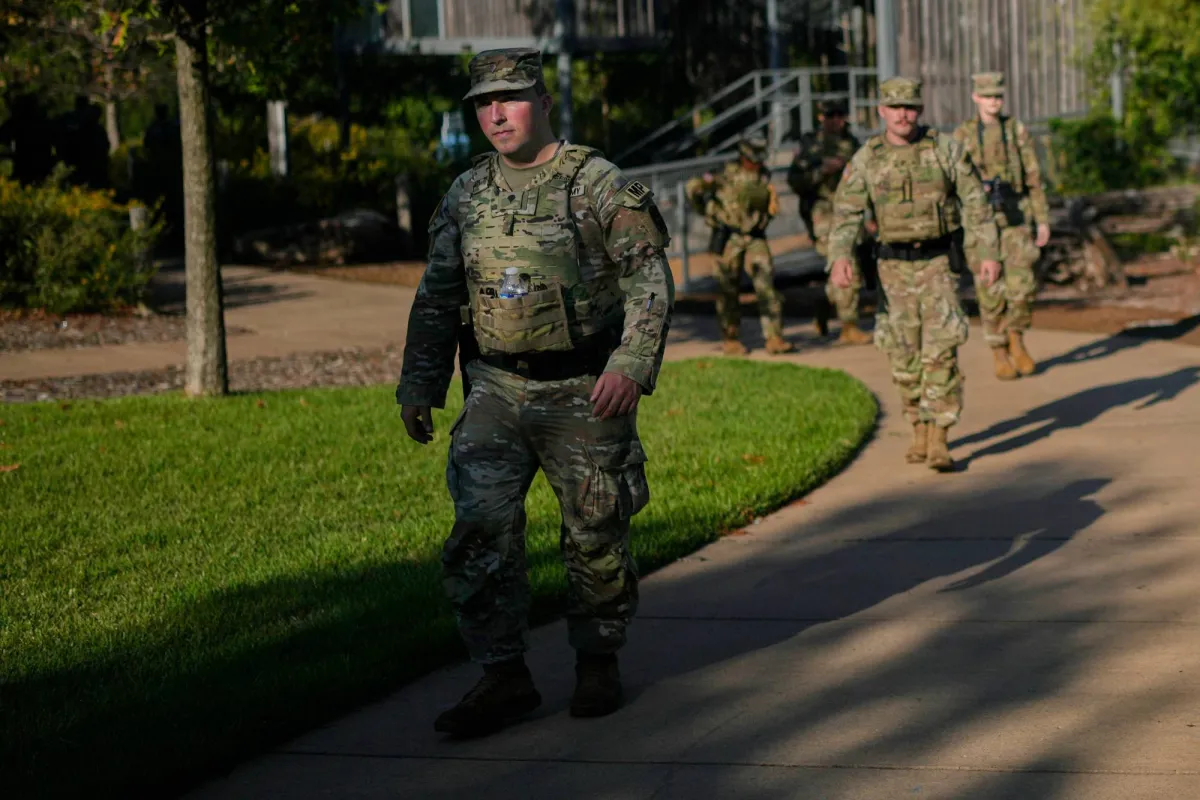 جنود من الحرس الوطني الأميركي خلال دورية في حديقة عامة قرب نهر المسيسيبي (أ.ب)