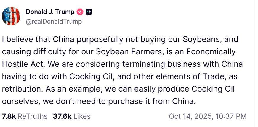 وعَدّ الرئيس الجمهوري قرار مستوردي فول الصويا الصينيين التوقف عن شراء فول الصويا من الولايات المتّحدة بمثابة «عمل عدائي اقتصادياً» يضرّ المزارعين الأميركيين.