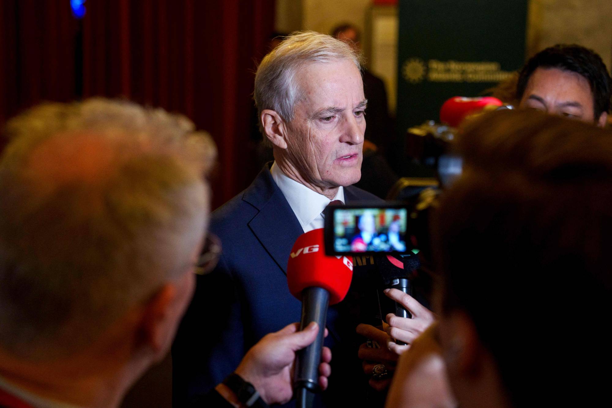 رئيس الوزراء النرويجي جوناس غار ستوير يتحدث للصحافة الاثنين في أوسلو حيث علق على علاقة ميتي ماريت بإبستين (أ.ف.ب)