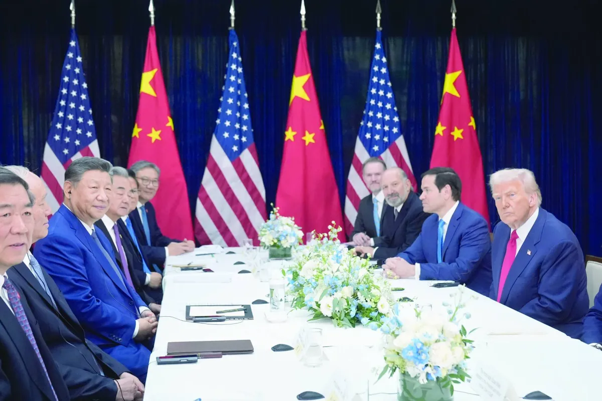 الرئيسان الأميركي دونالد ترمب والصيني شي جينبينغ مع فريقيهما خلال القمة في مطار جيمهاي بكوريا الجنوبية (أ.ب)