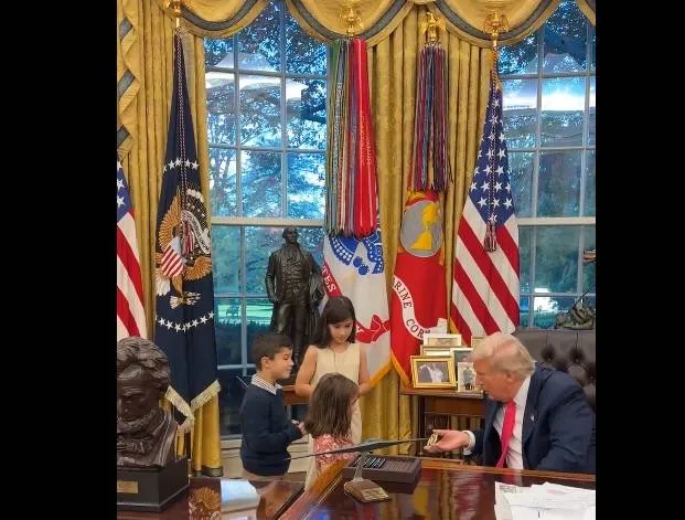 أوقف الرئيس الأميركي دونالد ترمب يوماً حافلاً في المكتب البيضاوي ليُحيّي الأطفال الزائرين، مُوزّعاً هدايا صغيرة، قائلاً: «اسمي دونالد»، في لحظة التقطتها وشاركتها مستشارة الاتصالات مارغو مارتن عبر الإنترنت.