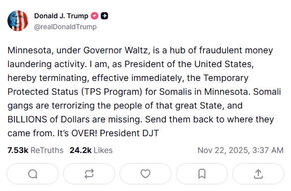 ووصف ترمب ولاية مينيسوتا بأنها «مركز لنشاط غسل الأموال المكتسبة عن طريق الاحتيال» في عهد الحاكم الديمقراطي تيم والز، وذلك في رد واضح على تقارير إعلامية لم يتم التحقق منها وأعاد عدد من النواب الجمهوريين نشرها، تقول إن حركة الشباب المتشددة في الصومال استفادت من عمليات احتيال ارتُكبت في مينيسوتا. ورد والز عبر منصة «إكس» قائلاً: «ليس من المستغرب أن يقرر الرئيس استهداف جالية بكاملها على نحو عشوائي».