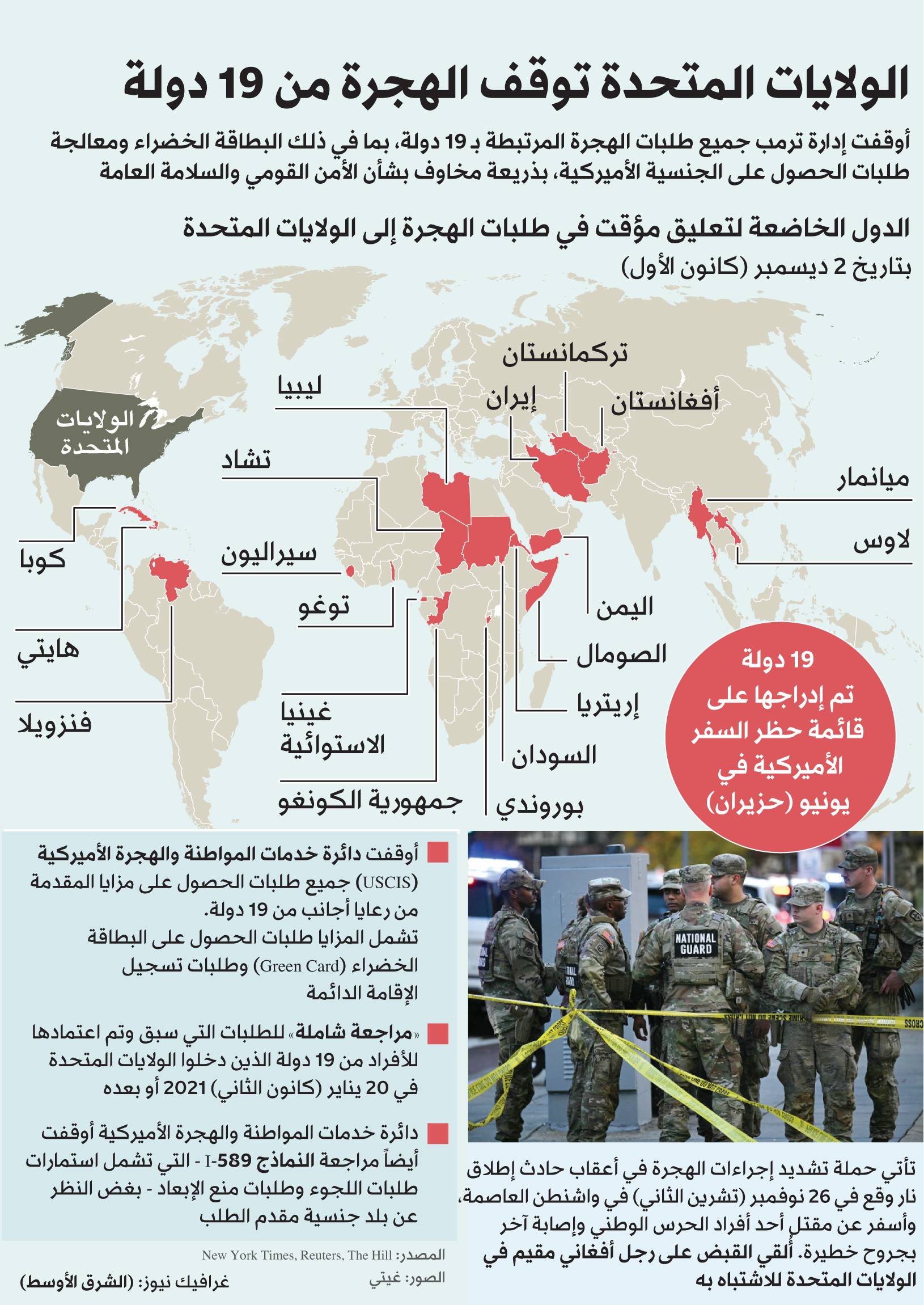اتّخذت إدارة الرئيس الأميركي دونالد ترمب حزمة إجراءات جديدة، الثلاثاء، للحدّ من الهجرة إلى الولايات المتحدة عبر تعليق جميع طلبات الهجرة لمواطني 19 دولة، بينها أفغانستان واليمن والسودان. يأتي التحرّك الأخير بعدما أشار مسؤولون أميركيون مؤخراً إلى أنهم سيُشدّدون بشكل كبير القيود على الهجرة، بعد إطلاق نار أدّى إلى مقتل جندية من الحرس الوطني، وإصابة زميل لها بجروح بالغة الأسبوع الماضي، واتُّهم فيه مواطن أفغاني.