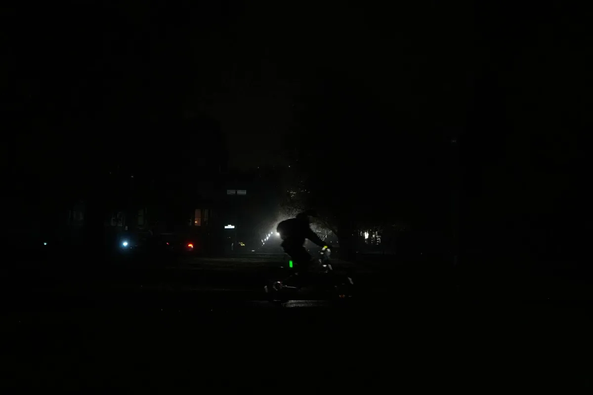 راكب دراجة هوائية يمر أمام أضواء سيارة قادمة في أحد شوارع سان فرانسيسكو في ظل انقطاعات التيار الكهربائي (أ.ب)