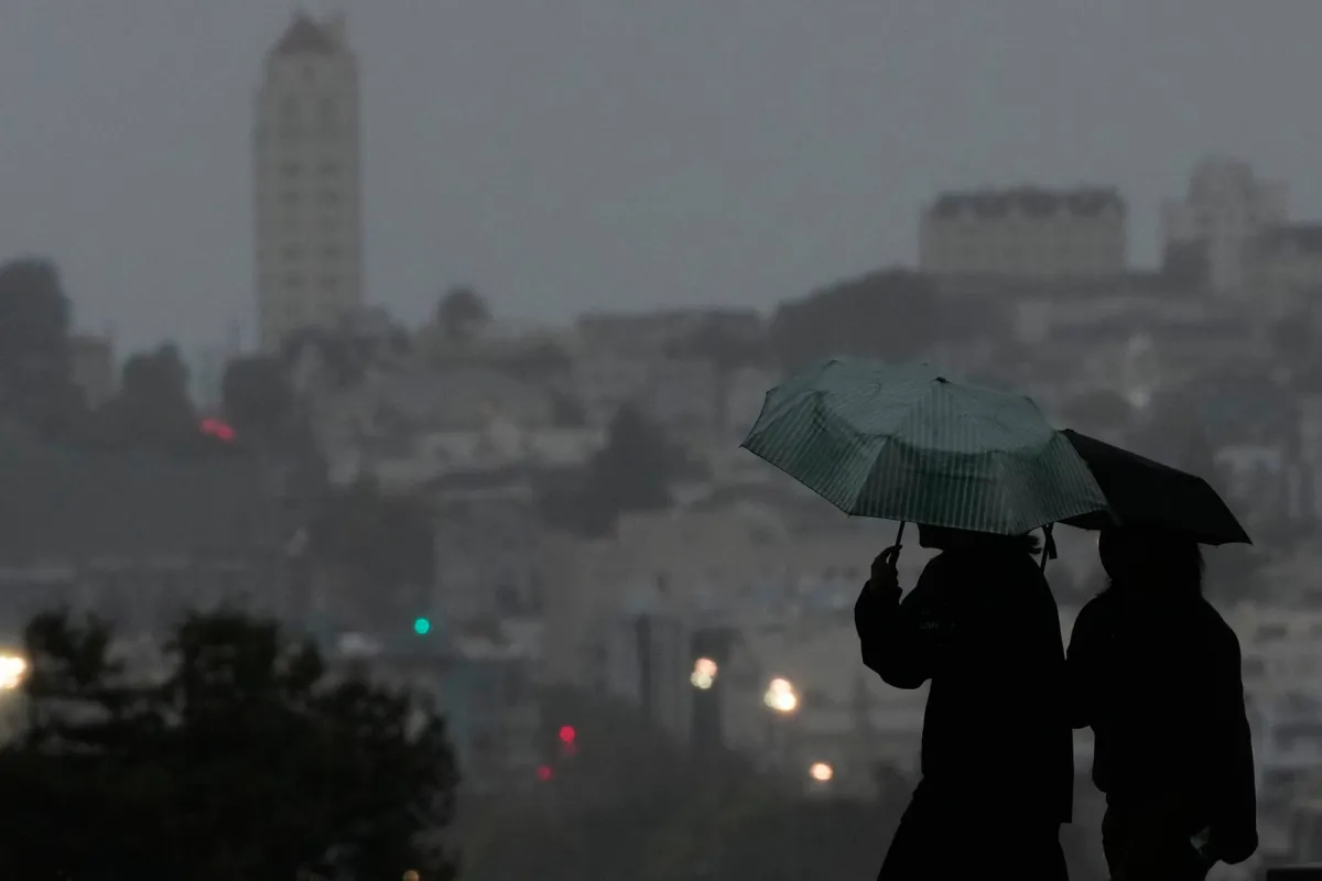 بعض الناس يحملون مظلات خلال سيرهم على ممر بحديقة «ألامو سكوير» في سان فرانسيسكو (أ.ب)