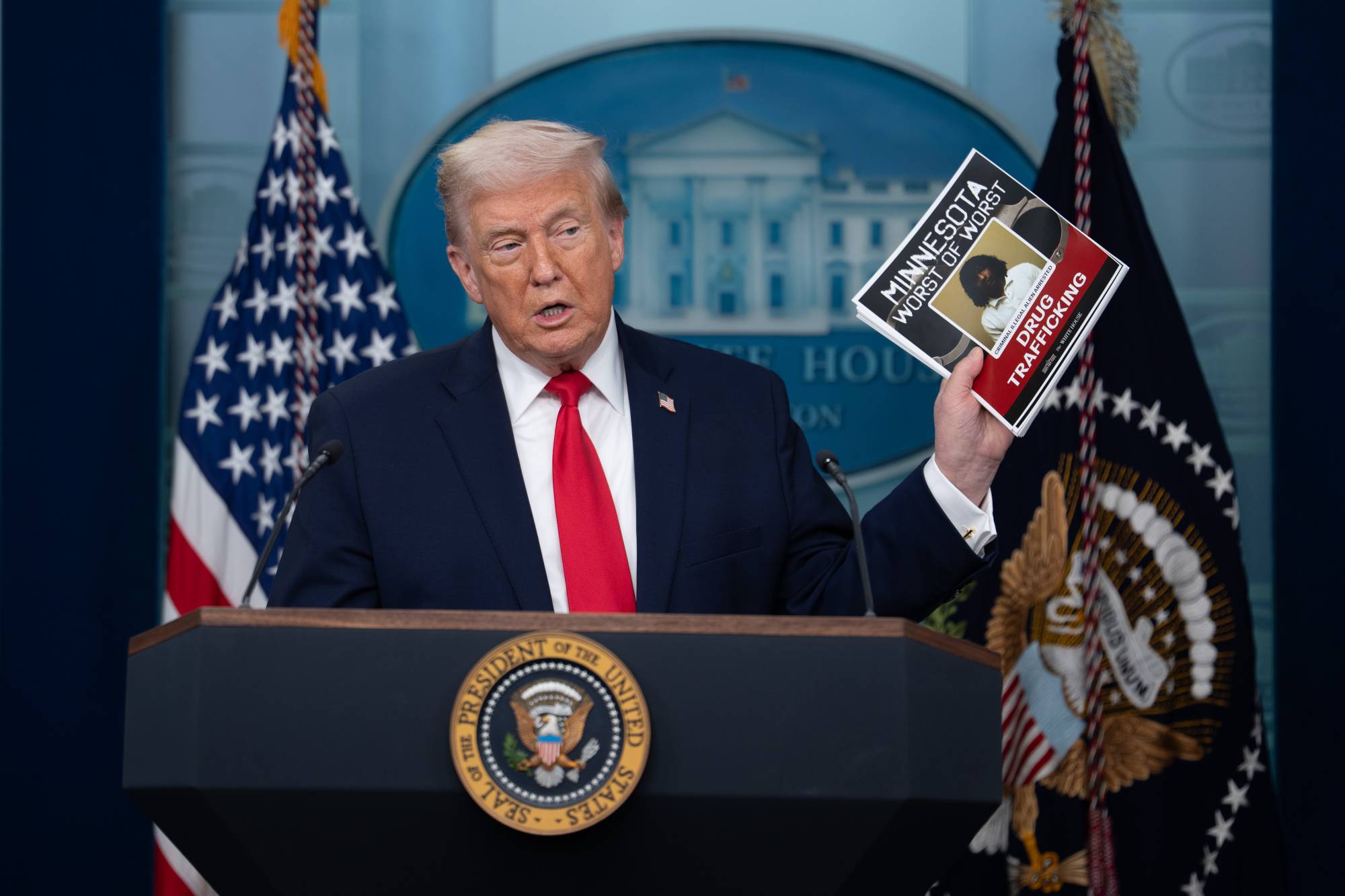 وكذلك، أشار إلى أن الولايات المتحدة ستواصل ضرباتها العسكرية ضد المشتبه في تهريبهم المخدرات إلى الولايات المتحدة عبر البحر الكاريبي والمحيط الهادئ، مضيفاً أنه قد يوسع حملته من أميركا الجنوبية إلى أميركا الشمالية. وقال: «نعرف طرقهم. نعرف كل شيء عنهم. نعرف أماكن إقامتهم. نعرف كل شيء عنهم. سنضرب العصابات».