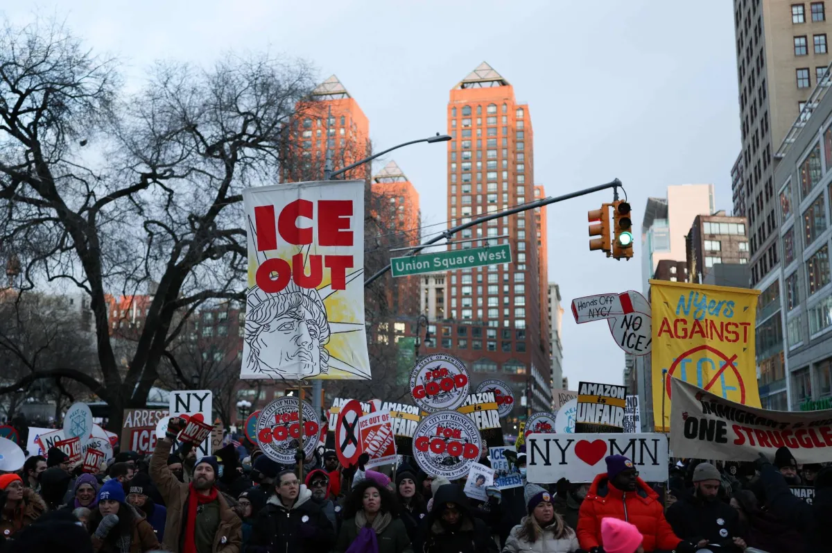 مظاهرة في نيويورك الجمعة ضد إدارة الهجرة والجمارك تضامناً مع مينيابوليس (أ.ب)