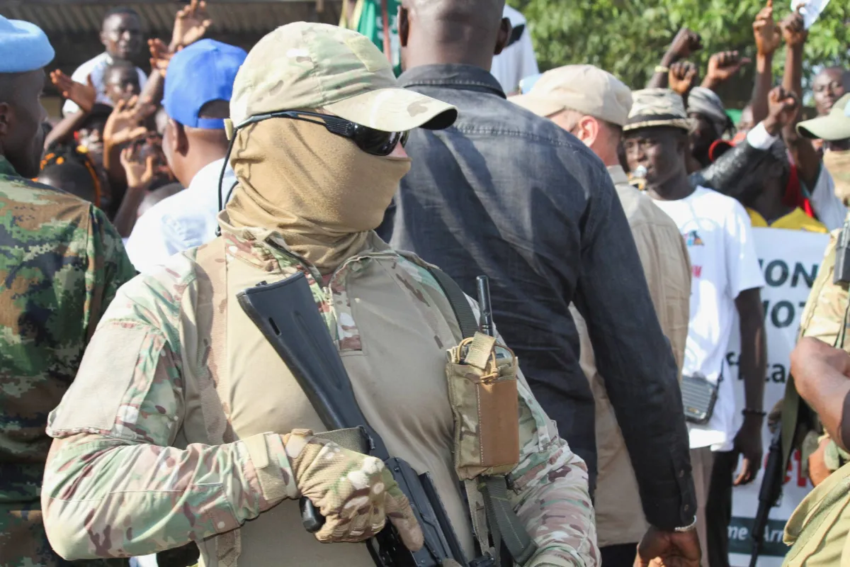 عناصر من «فاغنر» يقومون بحراسة رئيس جمهورية أفريقيا الوسطى (رويترز)