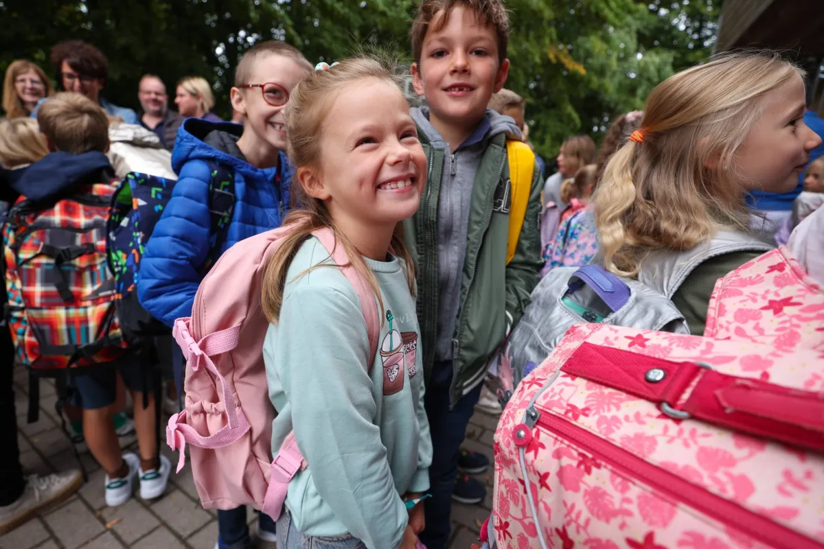 أطفال عند وصولهم لحضور اليوم الأول من المدرسة الابتدائية في تمبلوكس ببلجيكا في 28 أغسطس 2023 (إ.ب.أ)