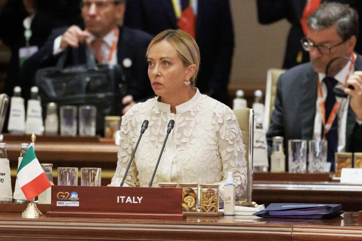 رئيسة الوزراء الإيطالية جورجيا ميلوني خلال حضورها الجلسة الصباحية لقمة دول مجموعة العشرين في نيودلهي (د.ب.أ)