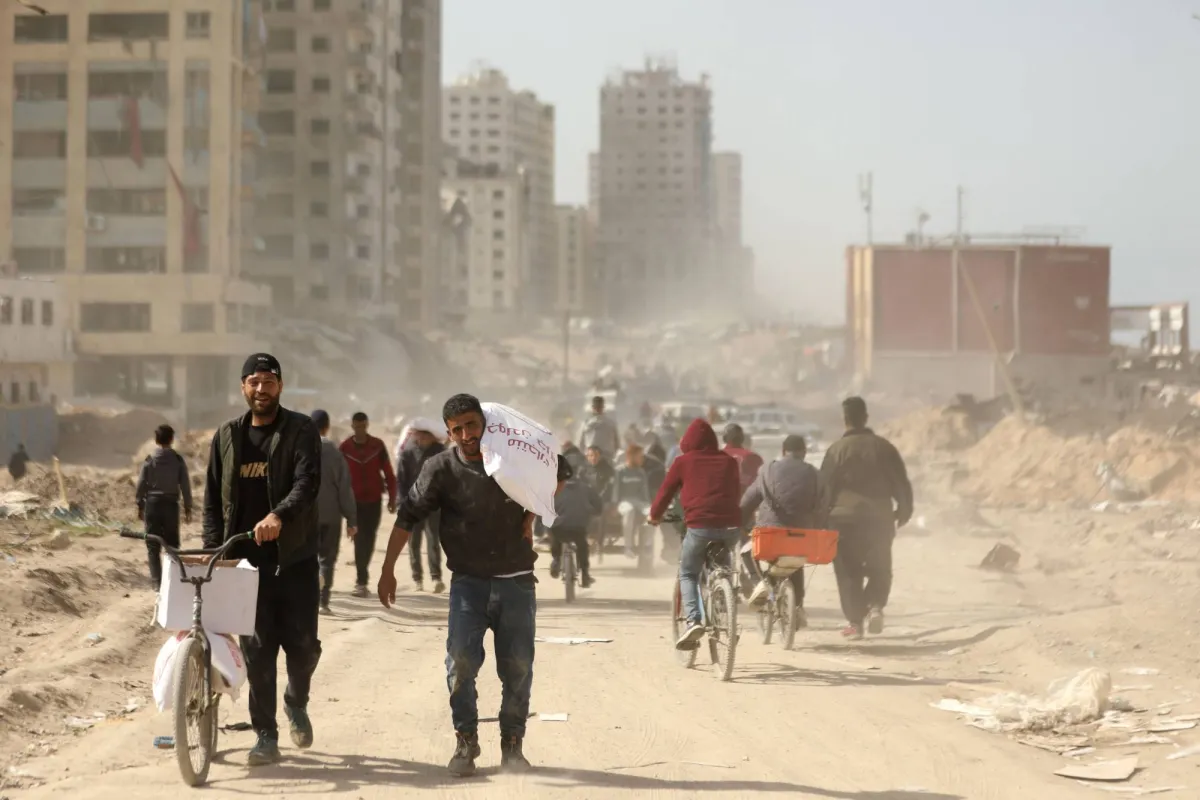 غزيون يحملون أكياس طحين كانت جزءاً من مساعدات دخلت مدينة غزة  (أ.ف.ب)