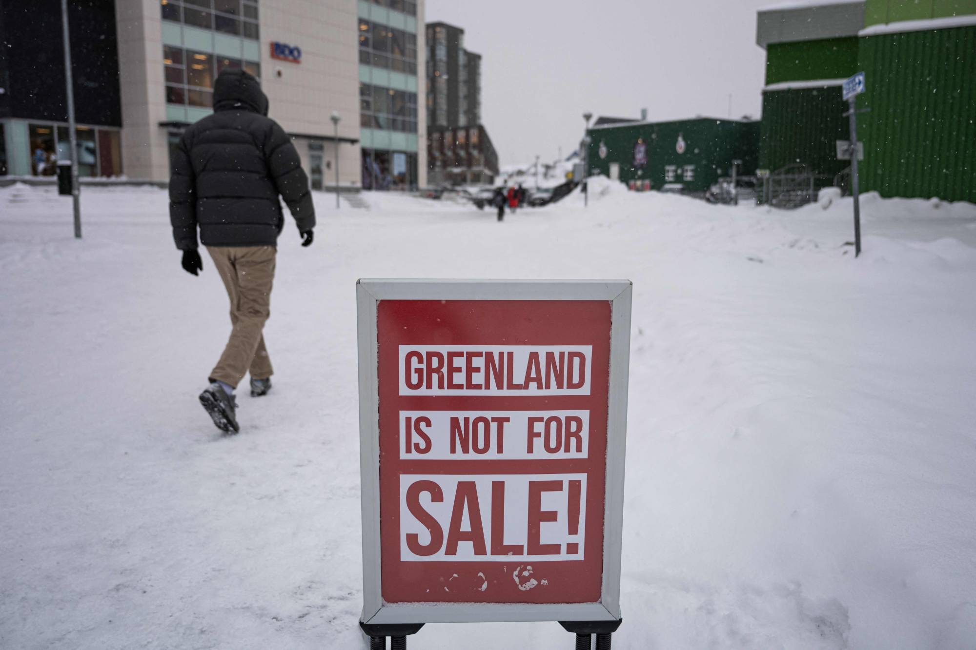 لافتة كبيرة كُتب عليها «غرينلاند ليست للبيع» تظهر خارج متجر ملابس في نوك (أ.ف.ب)