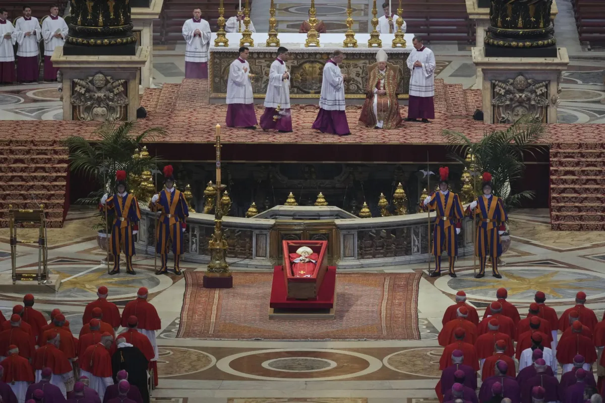 وسار كرادلة وأساقفة يرتدون قبعات حمراء اللون، ورهبان يحملون الشموع، وأفراد الحرس السويسري (جيش الفاتيكان)، ببطء في الساحة أمام كاتدرائية القديس بطرس بينما انطلقت جوقة بالمزامير والصلوات باللغة اللاتينية على خلفية أجراس خافتة، وفقاً لـ«رويترز».