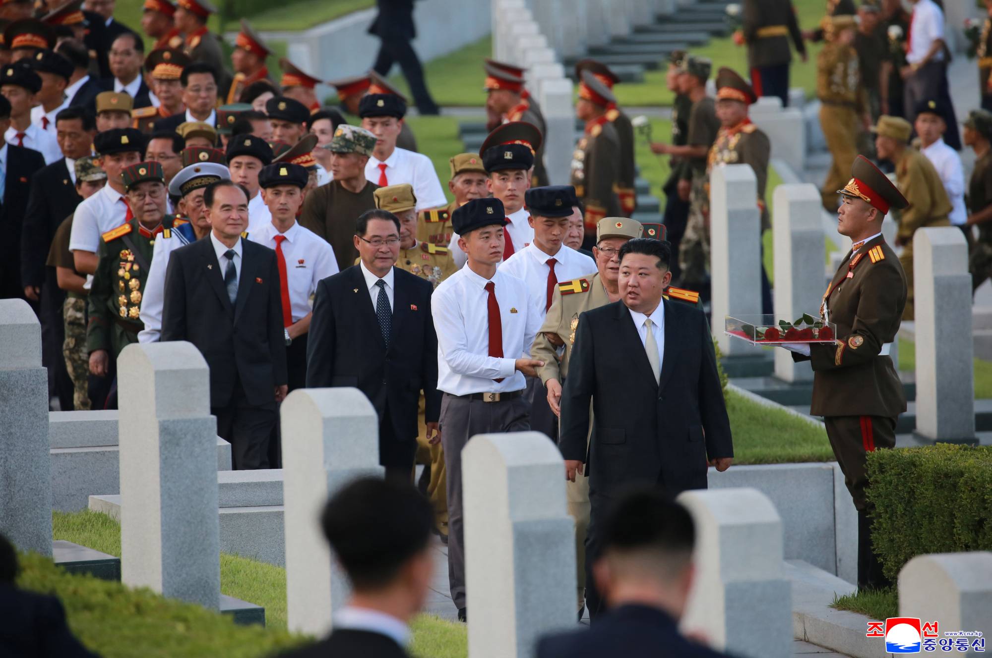 زعيم كوريا الشمالية كيم جونغ أون يزور مقبرة ضحايا الحرب خلال إحياء البلاد ذكرى الهدنة في الحرب الكورية (رويترز)