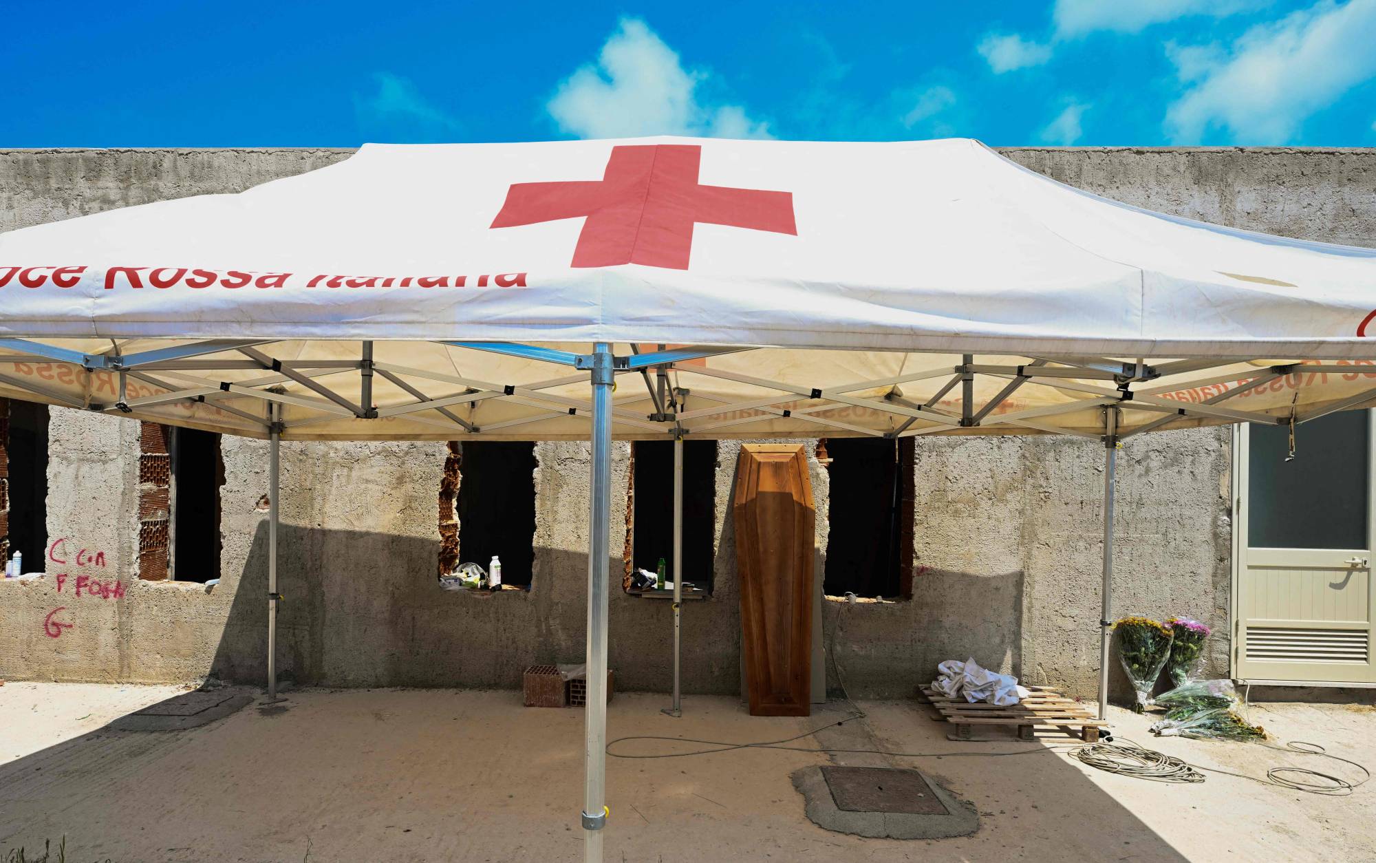 شعار «الصليب الأحمر» الإيطالي يظهر على مظلة أمام مقبرة في لامبيدوسا (أ.ف.ب)