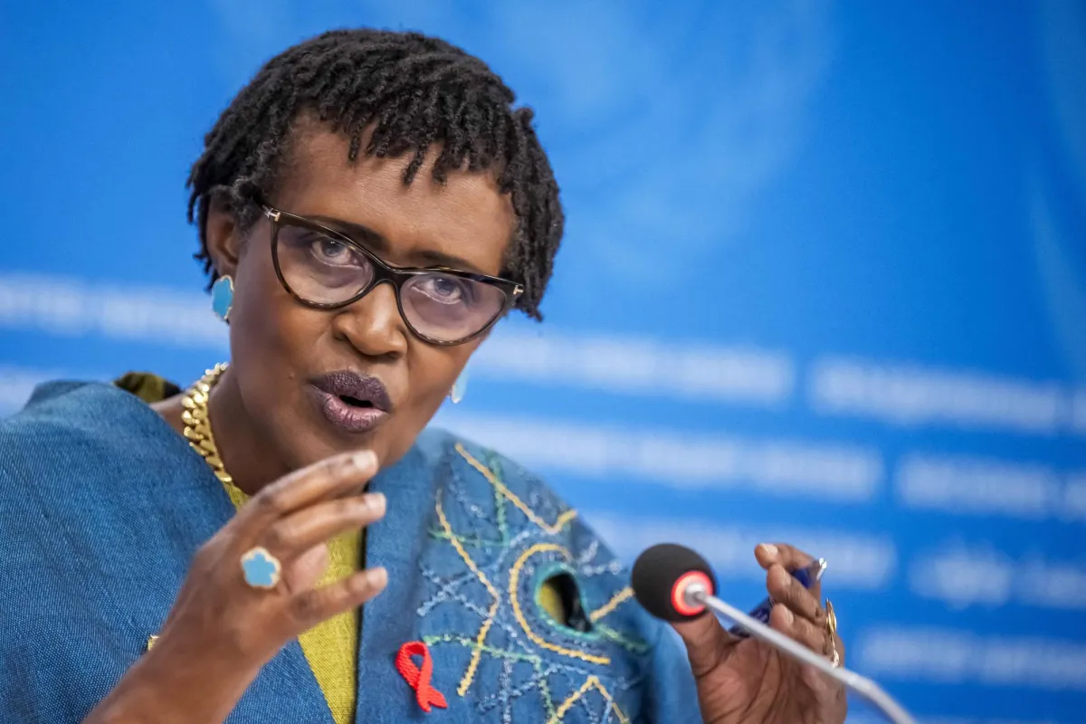 المديرة التنفيذية لبرنامج الأمم المتحدة المشترك لمكافحة الإيدز ويني بيانيما خلال مؤتمر صحافي قبل اليوم العالمي للإيدز 2025 في مكاتب الأمم المتحدة في جنيف... 25 نوفمبر 2025 (أ.ف.ب)
