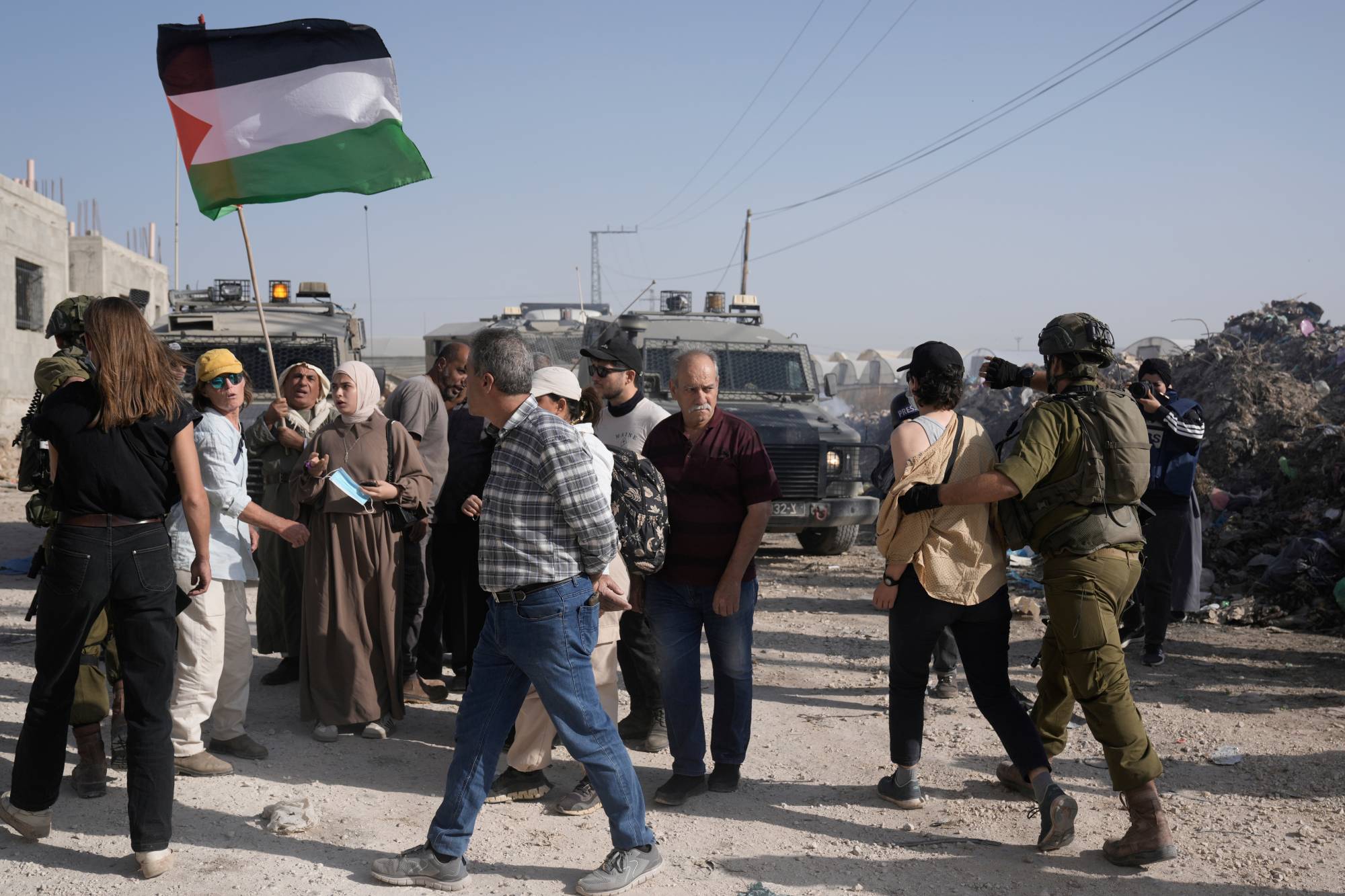 جنود من الجيش الإسرائيلي يفرّقون متظاهرين مطالبين بعودة النازحين الفلسطينيين إلى منازلهم في مخيم نور شمس للاجئين بمدينة طولكرم بالضفة الغربية يوم 23 نوفمبر 2025 (أ.ب)