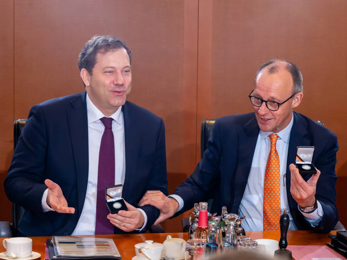 صورة ملتقطة في 14 يناير 2026 في برلين تظهر المستشار الألماني فريدريش ميرتس (يمين) ووزير المالية لارس كلينغبايل في بداية اجتماع مجلس الوزراء (د.ب.أ)