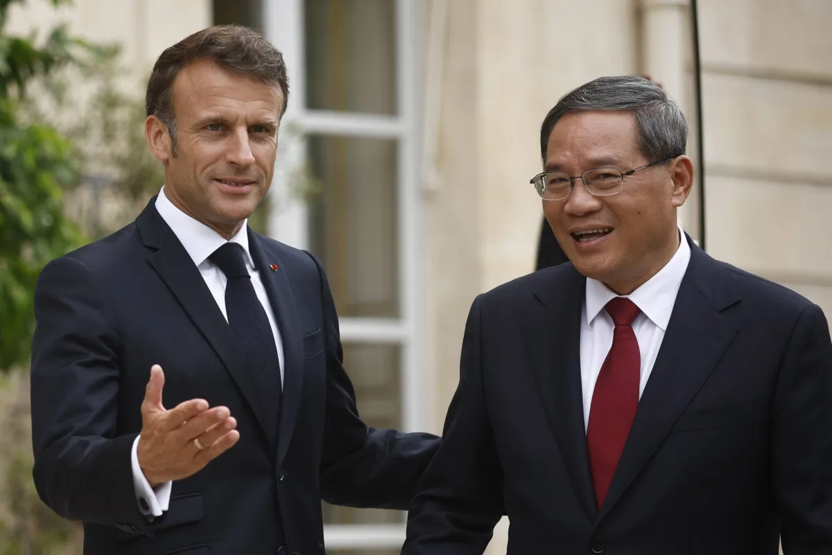 رئيس الوزراء الصيني لي تشيانغ (يمين) والرئيس الفرنسي إيمانويل ماكرون (يسار) (إ.ب.أ)