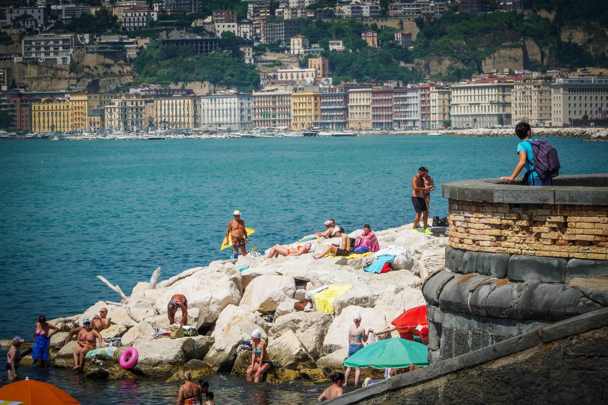 يقضي الناس وقتاً على الشاطئ خلال يوم حار في نابولي (إ.ب.أ)
