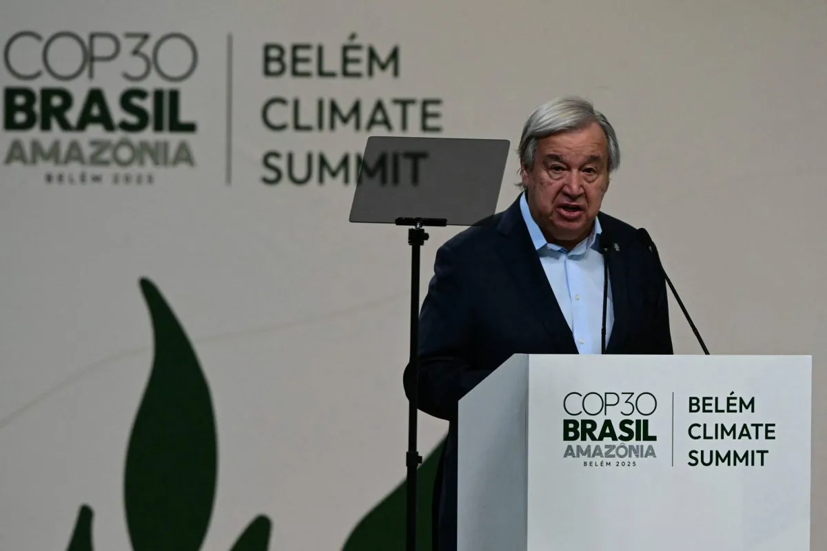 الأمين العام للأمم المتحدة أنطونيو غوتيريش يلقي كلمة خلال الجلسة العامة للقادة في إطار مؤتمر الأمم المتحدة لتغير المناخ «كوب 30» في بيليم بولاية بارا بالبرازيل 6 نوفمبر 2025 (أ.ف.ب)