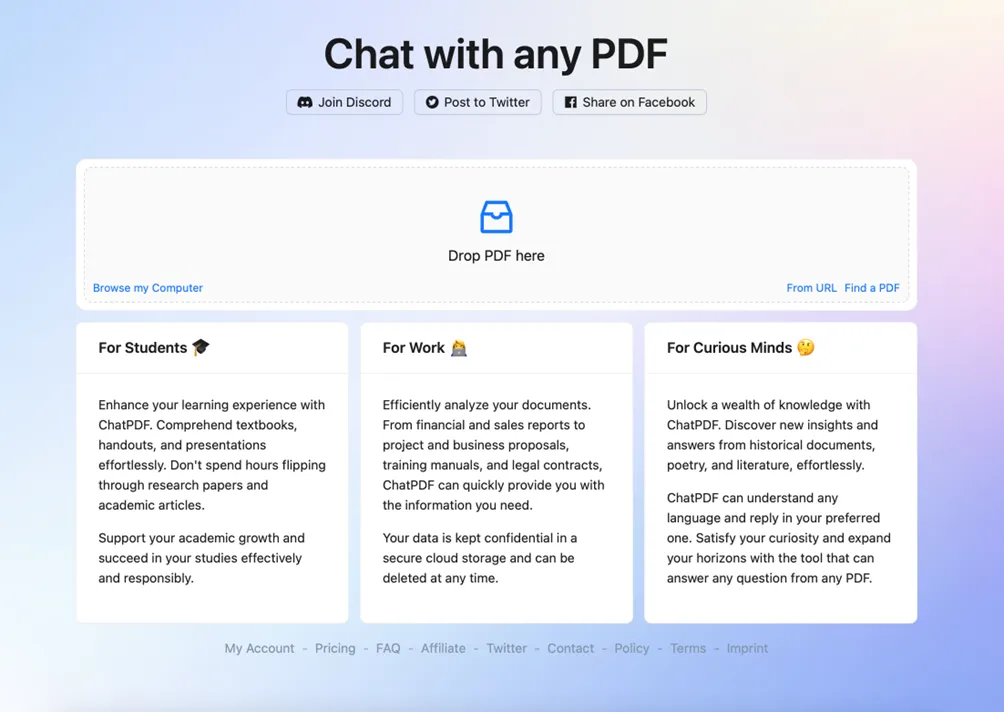 أما للأفراد الذين يبحثون عن معرفة أكبر، تقدم «ChatPDF» الفرصة لاكتشاف عالم جديد من المعلومات. يمكن تفحص الوثائق التاريخية، الشعر والأدب بكل سهولة، والحصول على رؤى وأجوبة جديدة. بالإضافة إلى ذلك، تقدم الأداة القدرة على فهم أي لغة والرد باللغة التي يفضلها المستخدم.