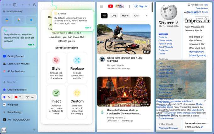 على سبيل المثال، بدل رصّ النوافذ بشكلٍ أفقي فوق الصفحة، يضعها «آرك» بشكلٍ عمودي في شريحة جانبية إلى اليسار، ما يساعد المستخدم في إبقاء مجموعة من النوافذ مفتوحة دون أن يتقلّص حجمها إلى درجة تجعل عناوينها غير مقروءة. ولكن تجدر الإشارة إلى أنّ هذه الفكرة ليست جديدة لأنّ متصفّح «إيدج من مايكروسوفت» سبق في تقديم النوافذ لمستخدميه بهذه الطريقة. ولكن في حالة «آرك»، ليس وضع النوافذ في شريحة جانبية إلّا خطوة أولى في تسهيل التعامل معها، إذ يمكنكم أيضاً وضع التطبيقات الإلكترونية التي تستخدمونها دائماً في الأعلى حيث تظهر على شكل أيقونات، ومن ثمّ تثبيت المواقع الإلكترونية التي تستخدمونها بشكلٍ متكرّر تحت التطبيقات. لا شكّ في أنّكم سترغبون في تثبيت بعضها على اعتبار أنّ المتصفّح يعمد من وقتٍ إلى آخر إلى أرشفة النوافذ غير المثبّتة بدل تركها لتتراكم لتصبح مائة نافذة مفتوحة في وقتٍ واحد.