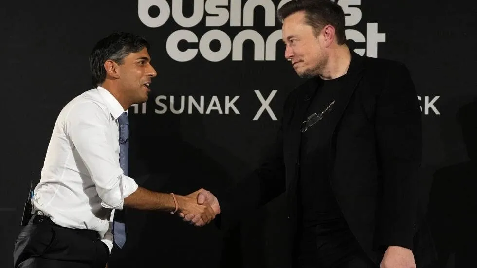إيلون ماسك خلال محادثة مع رئيس الوزراء البريطاني ريشي سوناك في نهاية قمة الذكاء الاصطناعي في المملكة المتحدة (أ.ف.ب)