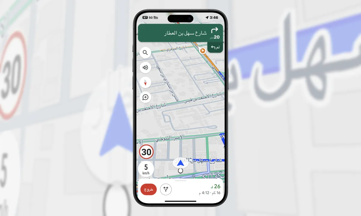 عند بدء التنقل، يظهر مقياس السرعة في الزاوية السفلية للتطبيق، مع عرض سرعة السيارة بوحدات الميل أو الكيلومتر حسب المنطقة. يمكن تفعيل الميزة عن طريق النقر على صورة الملف الشخصي في تطبيق خرائط «غوغل» على «آيفون» ثم الذهاب إلى الإعدادات (Settings) > التنقل (Navigation) > خيارات القيادة (Driving options). بمجرد تفعيلها، ستتغير ألوان مؤشر السرعة لتنبيهك بالبقاء ضمن حدود السرعة المحددة في منطقتك.