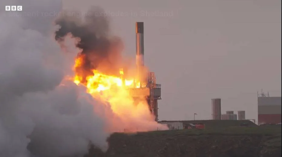 انفجر محرك صاروخ واحترق في أثناء اختبار بميناء ساكسافورد الفضائي في أسكوتلندا والذي أصبح العام الماضي أول موقع مرخص لإطلاق الصواريخ عموديا في بريطانيا.