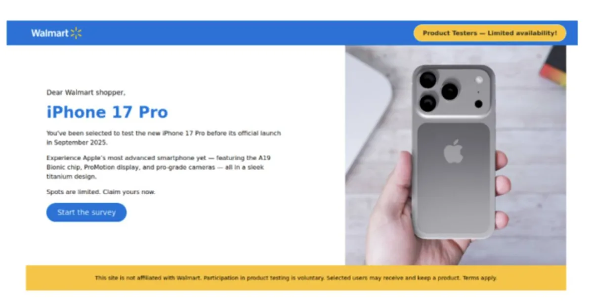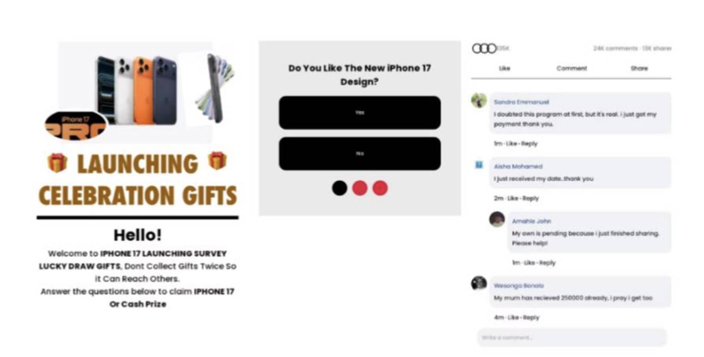 يلجأ المجرمون أيضاً إلى حيلة «الهدايا المجانية». فقد رصدت «Kaspersky» صفحات تدّعي الاحتفال بإطلاق «آيفون 17» عبر منح أجهزة مجانية، حيث يُطلب من الزوار تعبئة استبيانات وتقديم عناوين بريد إلكتروني وأرقام هواتف، ودفع رسوم شحن رمزية لاستلام «الجائزة». ولإضفاء المصداقية، تُعرض تعليقات وصور «فائزين» وهميين، لكن الهاتف الموعود لا يصل أبداً، وتُباع البيانات المسروقة أو تُستغل لاحقاً في هجمات أخرى.