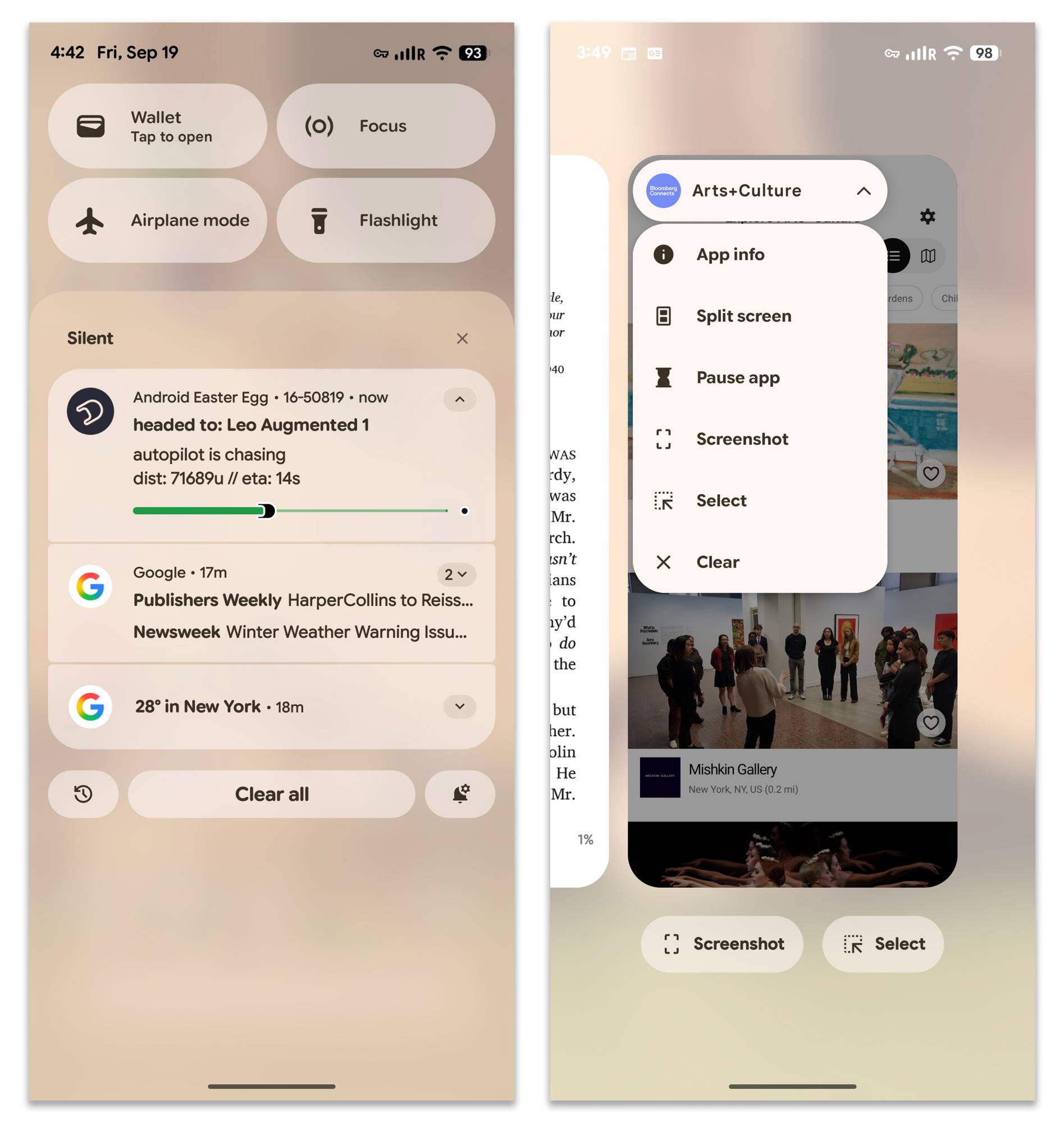 ولن يكون تحديث «أندرويد» من دون هدية «عيد الفصح» (Easter egg). للعثور عليها، اذهب إلى الإعدادات، ثم «حول الهاتف»، ثم «إصدار أندرويد». في الشاشة التالية، انقر على «إصدار أندرويد 16» بشكل متكرر حتى تتغير الشاشة. اضغط مع الاستمرار على شعار «أندرويد 16» لبدء لعبة استكشاف الفضاء.