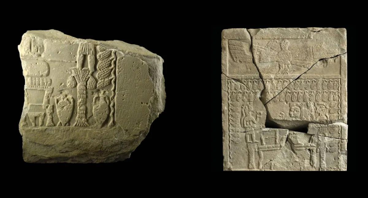 يحمل هذان النقشان التصويريان طابعاً آشورياً، ويصعب تحديد تاريخهما بدقّة، ويرى أهل الاختصاص أنهما على الأرجح من نتاج الفترة الممتدة من القرن السابع إلى القرن السادس قبل الميلاد. يصوّر النقشان مشهداً طقوسياً نذرياً، تحتلّ فيه الكرمة والنخلة مكاناً بارزاً، وهذان العنصران معروفان في ميراث الشرق القديم. يرد ذكر الكروم في أقدم المصادر المسمارية، وتقول هذه المصادر إن جوديا، أحد أشهر ملوك سلالة لكش التي حكمت جنوب بلاد وادي الرافدين، كان أول من زرع العنب في الأراضي المطلة على الخليج. وقيل إن سنحاريب، سادس ملوك الإمبراطورية الأشورية الحديثة، أتى بعدد من الأشجار من خارج مملكته، وغرسها في عاصمته، وباتت الكروم تنمو في تلك الحقول أكثر مما كانت عليه في أراضيها الأصلية.