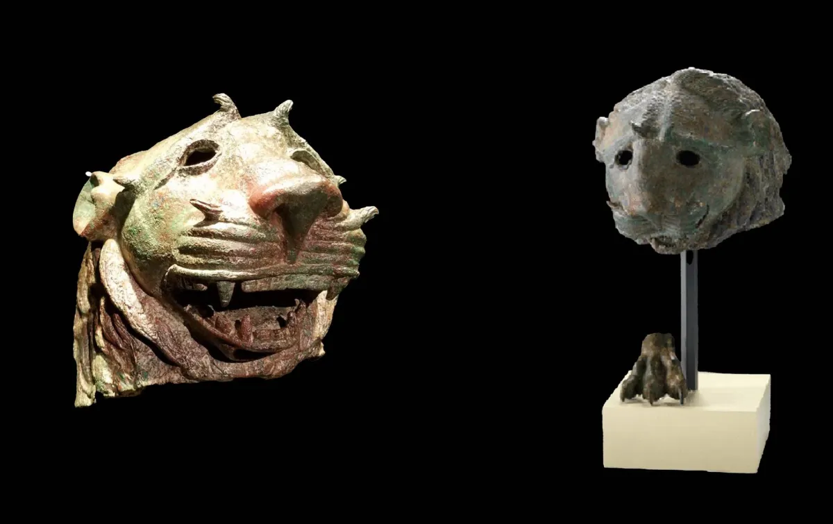 طول هذا الرأس البرونزي 32 سنتيمتراً، وعرضه 25 سنتيمتراً، ويمثّل أسداً يفتح شدقه إلى أقصى حدّ ويُظهِر أنيابه، وكأنه يزأر ويزمجر. أنفه عريض وبارز، ويتميّز بفتحتيه الكبيرتين المصوغتين بأسلوب واقعي. سالبه منقوش بدقة، ويتكوّن من أربع خصال أفقية متوازية، يعلوها شارب خامس طرفاه مقوّسان نحو الأعلى. عيناه لوزتان مجوّفتان فارغتان، يحدّ كل منهما إطار هدبي ناتئ. يعلو هاتين العينين حاجبان عريضان لكل منهما طرفان مقوّسان نحو الأعلى، وفقاً للأسلوب المتبع في نحت الشارب الأعلى. الأذنان دائريتان وكل منهما محدّدة بإطار ناتئ. الفم منفّذ برهافة بالغة، ويتمثّل بشدق عريض يكشف عن أسنان مرصوفة، مع نابين مسنّنين في الفكّ الأعلى، ونابين مشابهين في الفكّ الأوسط. تحيط بهذا الرأس المزمجر لبدة مكونة من خصال شعر متوازية، مع لحية تشكّل عقداً حول الذقن المنحنية البيضاوية.