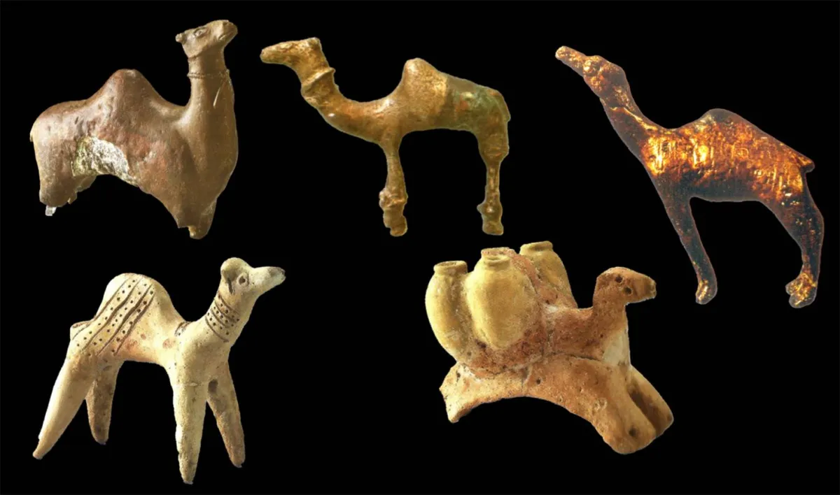 يظهر الجمل بأسلوب فنّي مغاير تماماً في تمثالين من الصلصال يغلب عليهما طابع التحوير والتبسيط والاختزال، وهما كذلك من الحجم الصغير الذي تميّز به هذا النوع من النحت، ولا يتجاوز طول كل منهما 15 سنتيمتراً. من جانب آخر، يقدّم هذان التمثالان صورتين مختلفتين للجمل؛ الصورة الأولى تقليدية، وفيها يظهر منتصباً على قوائمه. والصورة الأخرى غير مألوفة، وفيها يظهر كأنه يميل إلى الربوض، حاملاً فوق ظهره 4 جرات ضخمة. تزيّن التمثال الأول شبكة من الخطوط المحفورة، وتتكون هذه الشبكة من 4 خطوط موازية تستقرّ على السنام، تفصل بينها سلسلة من النقاط، و4 خطوط مشابهة تستقرّ على أعلى العنق. تحاكي هذه الشبكة، كما يبدو، الرحل الذي يوضع على الناقة ليجلس عليه الراكب، والعقد الهلالي الذي يزيّن عنق الجمل العربي. في المقابل؛ يشهد التمثال الثاني للدور الذي لعبه الجمل في التنقل إلى مسافات بعيدة من الجزيرة، وهو محمّل بالأمتعة الثقيلة. نقع على روايات توراتية تشير إلى هذا الدور؛ أشهرها قصة سفر ملكة سبأ لملاقاة الملك سليمان «بموكب عظيم جداً، بجمال حاملة أطياباً وذهباً كثيراً جداً وحجارةً كريمة» (سفر الملوك الأول 10: 2).