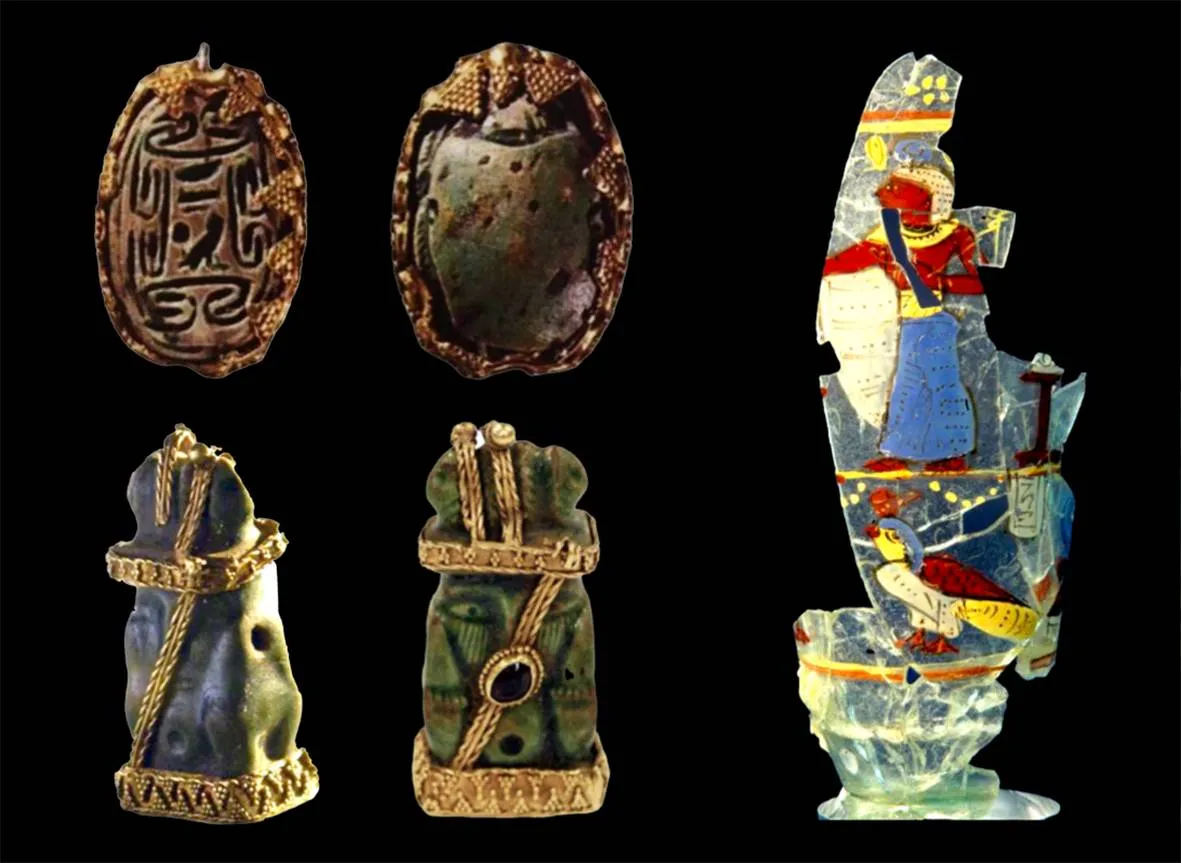 إلى جانب هذا الإناء، تحضر قطعتان منمنمتان من الخزف والذهب من النوع المصري، عُثر عليهما في عام 1982. القطعة الأولى خزفية بيضاوية يحيط بها إطار من الذهب، طولها 1.5 سنتيمتر، وهي على شكل ما تُعرف بـ«حشرة الجُعل»، وتتبع تقليداً راج استخدامه بشكل واسع بوصفه تميمة واقية من الشر. تُزيّن هذا الحجر كتابة منقوشة تحاكي الكتابة الهيروغليفية، وفيها يظهر «حورس» صقراً في وسط التأليف. وتُظهر قراءة هذه الكتابة أنها شكّلية فحسب، مما يوحي بأن هذه التميمة صُنعت على الطريقة المصرية خارج وادي النيل، ودخلت إلى هذه الناحية من الجزيرة العربية من الخارج، كما دخلت مثيلاتها نواحي عدة من الساحل الخليجي، في الكويت والبحرين وعُمان.
