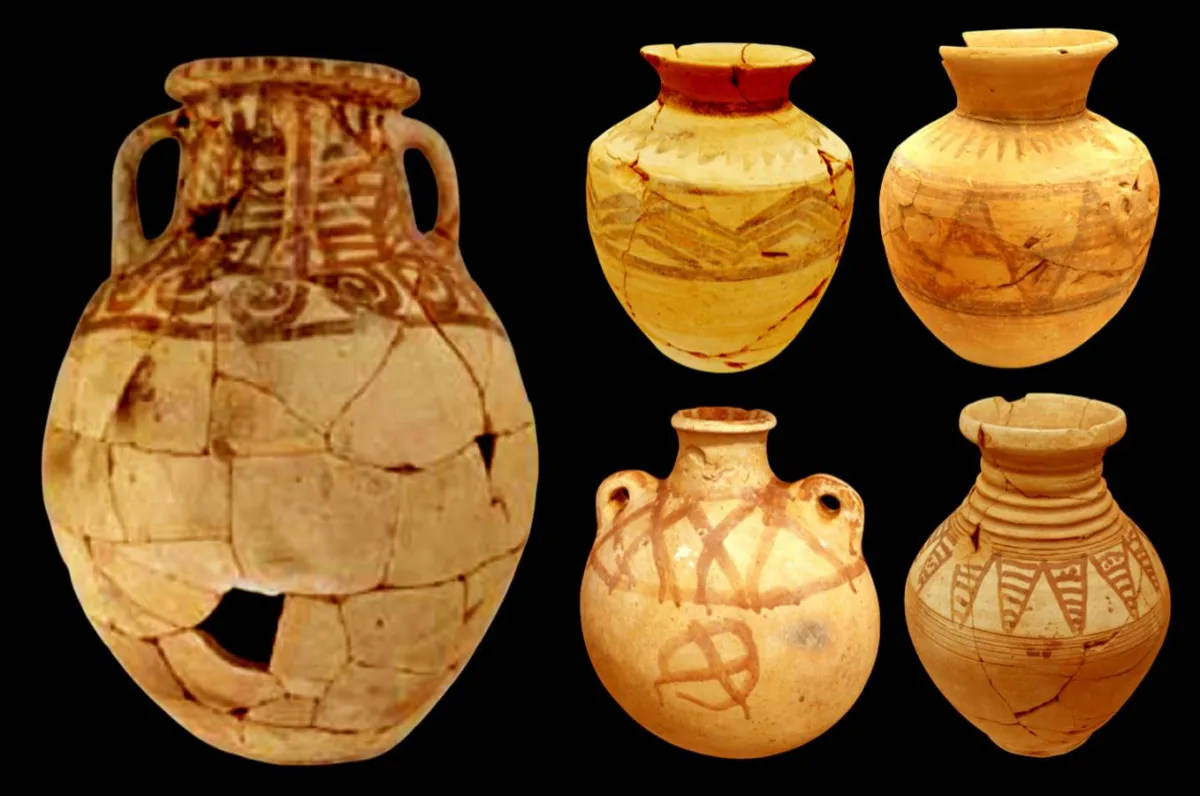 تظهر هذه التحوّلات الزخرفية في قطعتين تتشابهان من حيث التكوين، وهما جرتان مخروطيتان من الحجم الصغير، طول أكبرهما حجماً 9.8 سنتيمتر، وقطرها 8.5 سنتيمتر. تتمثّل زينة هذه الشبكة بثلاث شبكات مطليّة، أولاها شبكة من الخطوط الدائرية الأفقية تلتف حول القسم الأسفل من عنقها، وتشكّل قاعدة له، ثمّ شبكة من المثلثات المعكوسة تنعقد حول الجزء الأعلى من حوض هذا الإناء، وتتميّز بالدقة في الصوغ والتخطيط. تنعقد الشبكة الثالثة حول وسط الجرّة، وهي أكبر هذه الشبكات من حيث الحجم، وتتكوّن من كتل هرمية تعلو كلاً منها أربعة خطوط أفقية متوازية. في المقابل، يبلغ طول الجرة المشابهة 9 سنتيمترات، وقطرها 7.5 سنتيمتر، وتُزيّن وسطها شبكة عريضة تتكون من أنجم متوازية ومتداخلة، تعلو أطراف كلّ منها سلسلة من الخطوط الأفقية، صيغت بشكل هرمي. تكتمل هذه الزينة مع شبكة أخرى تلتفّ حول القسم الأعلى من الجرة، وتشكّل عقداً يتدلى من حول عنقها. ويتكوّن هذا العقد من سلسلة من الخطوط العمودية المتجانسة، مرصوفة على شكل أسنان المشط.