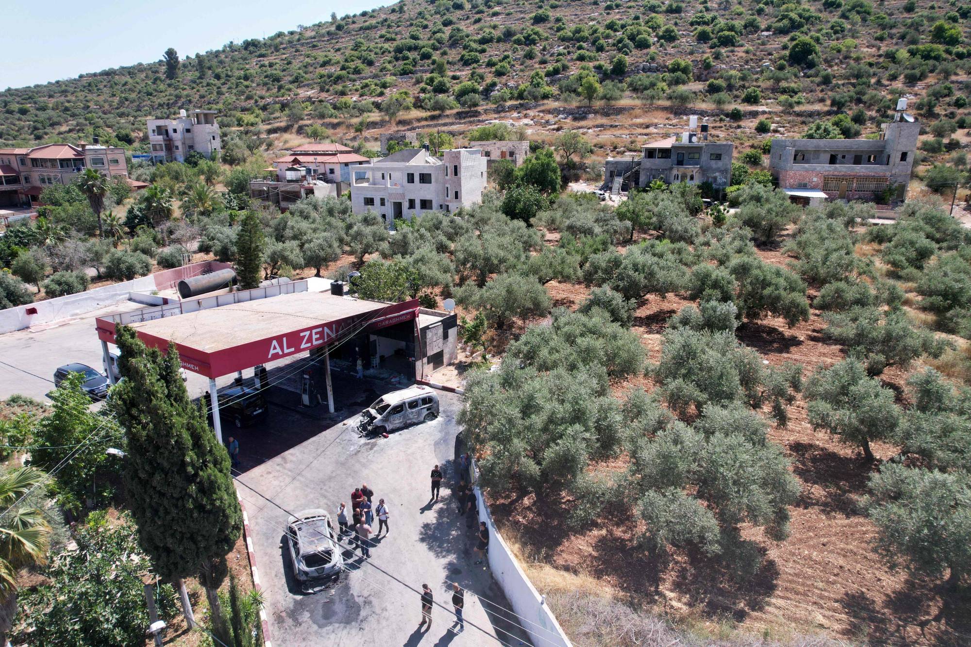 سيارات محترقة في محطة وقود باللبان الشرقية بالضفة تعرضت للتخريب من قبل مستوطنين الأربعاء (أ.ف.ب)