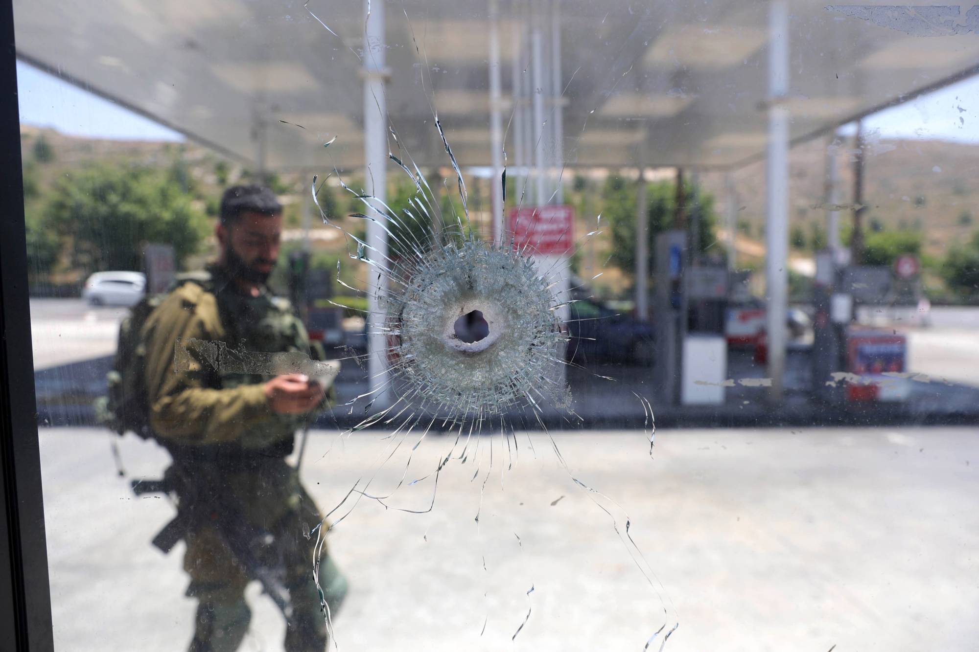 جندي إسرائيلي أمام كشك محطة الوقود حيث وقع هجوم خارج مستوطنة عيلي في الضفة (إ.ب.أ)
