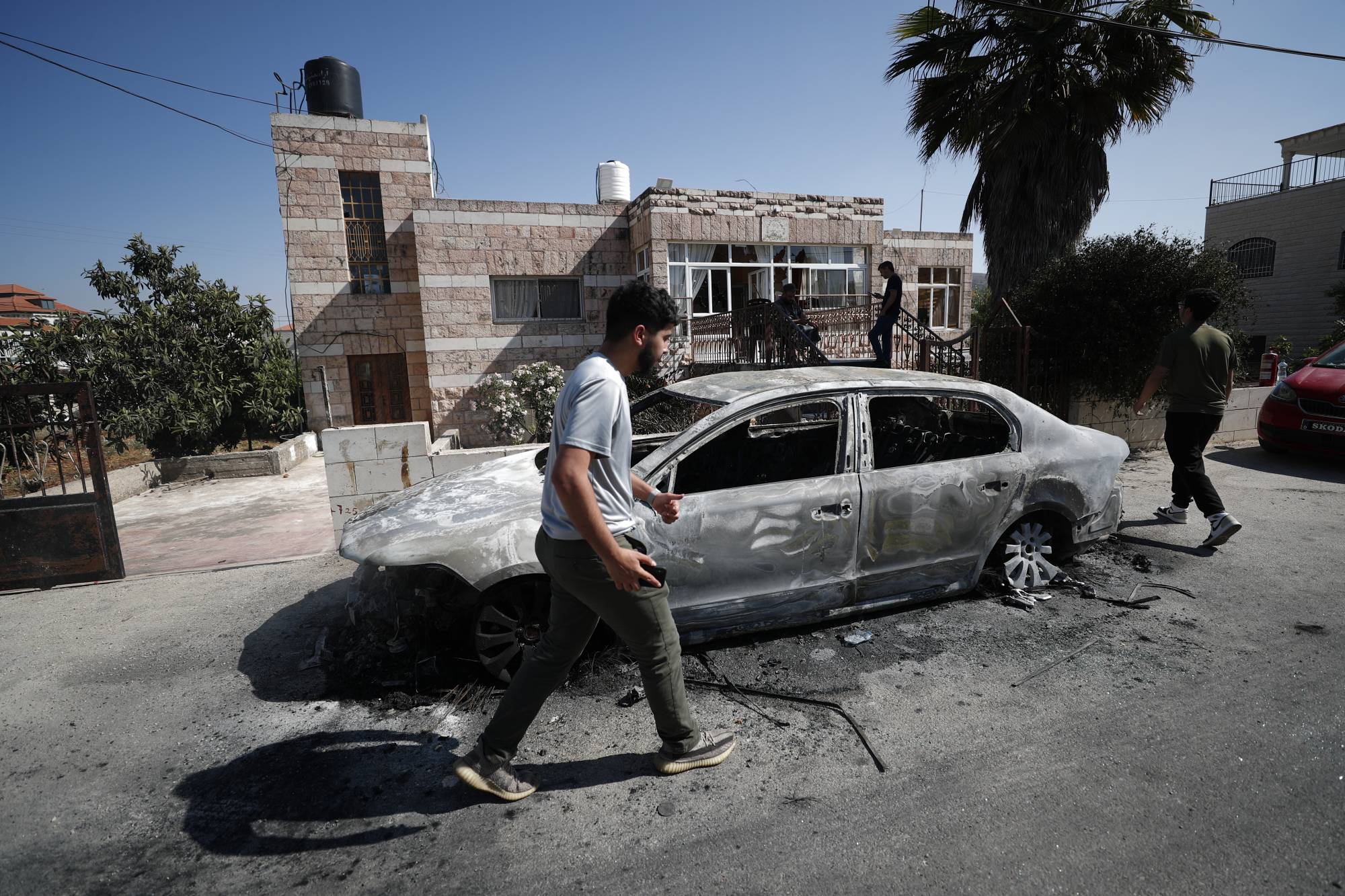سيارات محترقة في بلدة ترمسعيا الفلسطينية (إ.ب.أ)