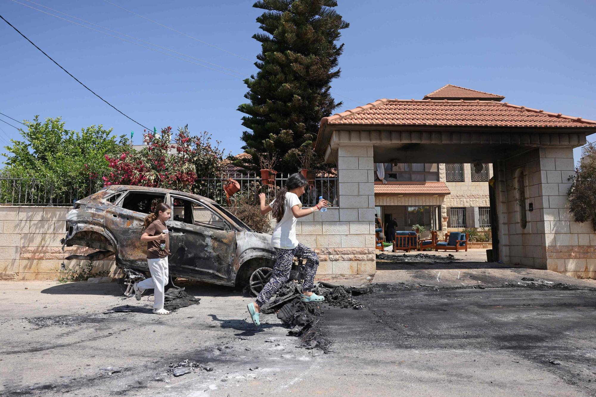 فلسطينيون يمرّون أمام سيارة محترقة أضرمها مستوطنون الأربعاء في ترمسعيا قرب رام الله (أ.ف.ب)