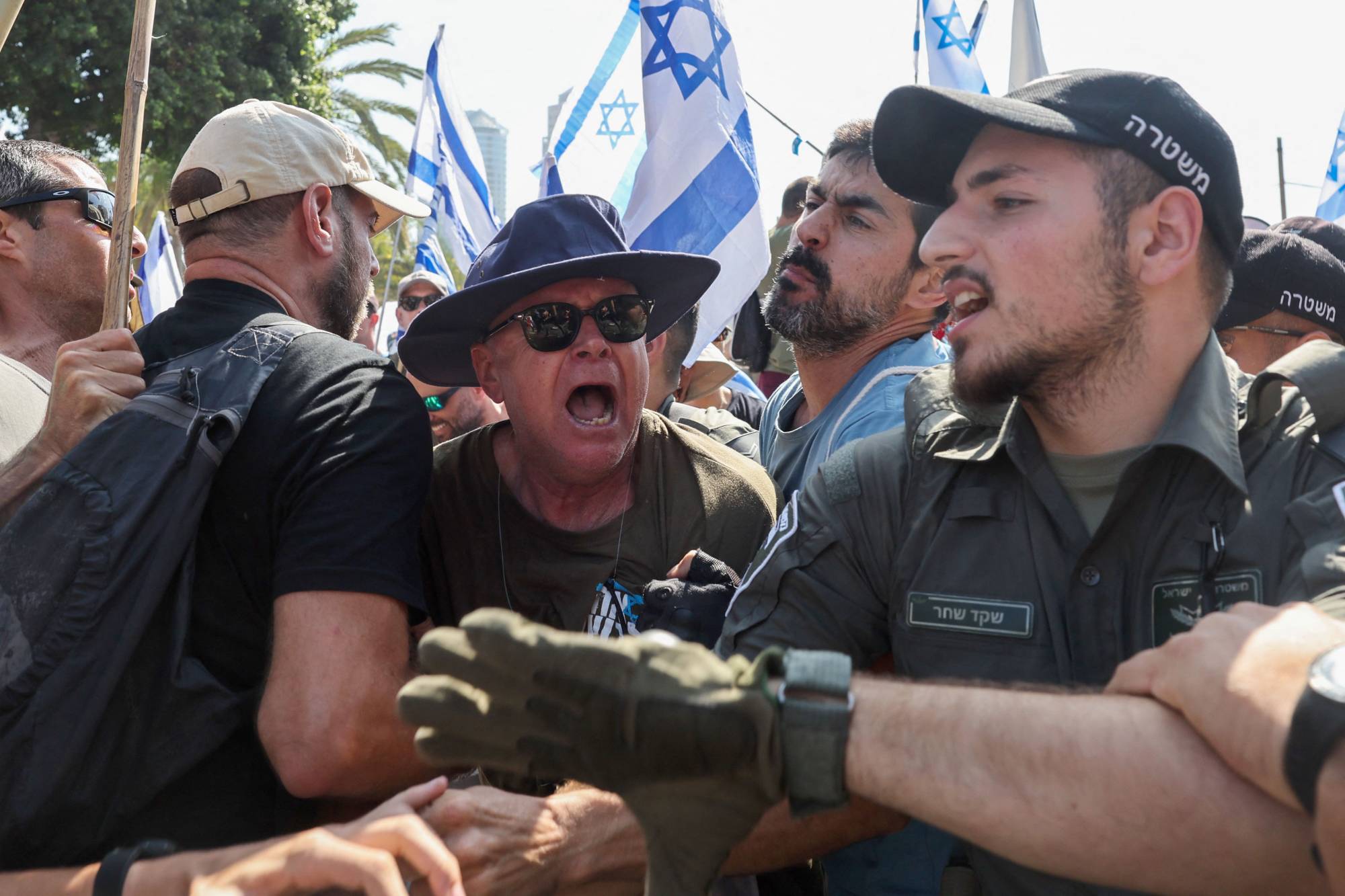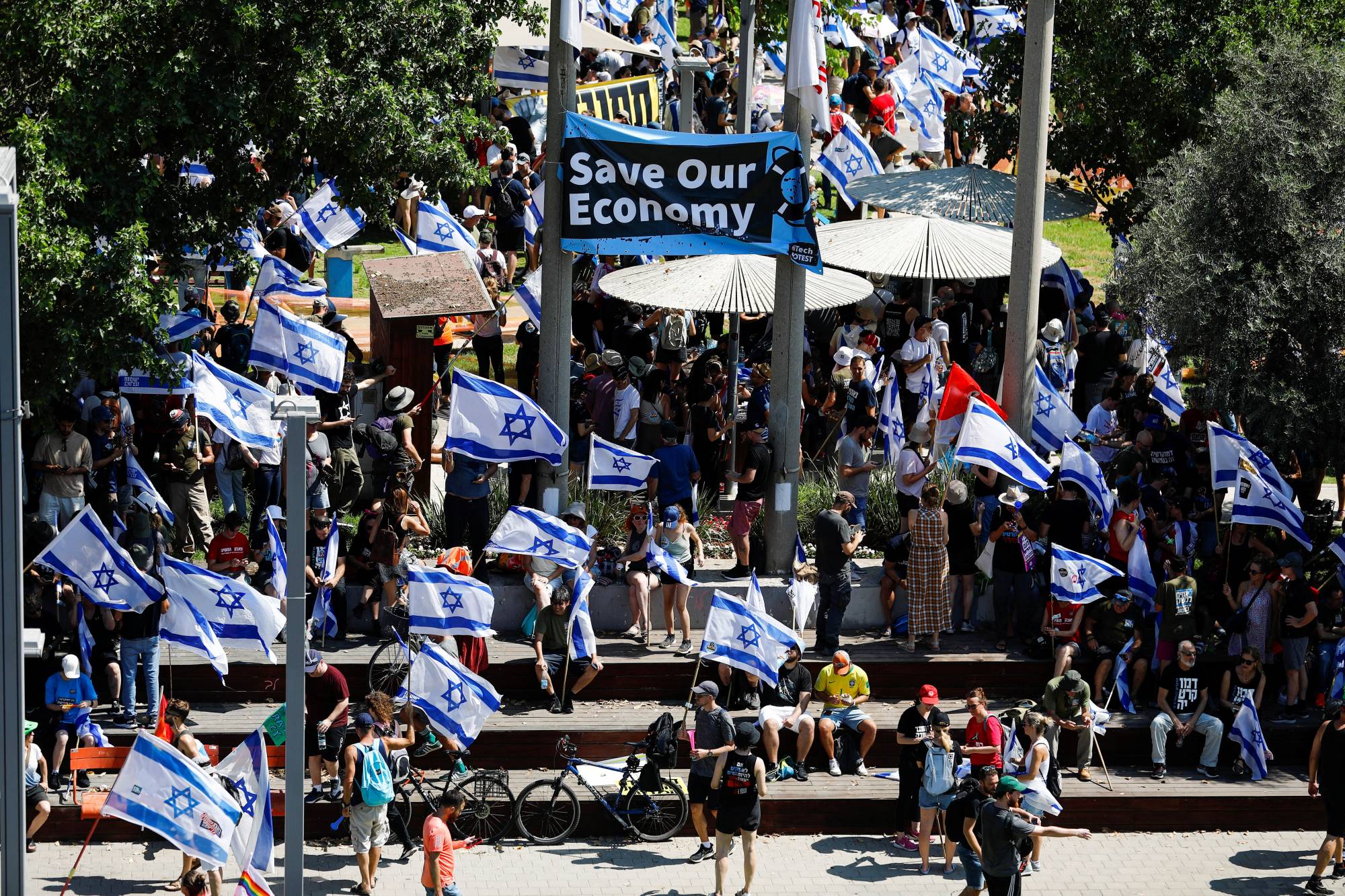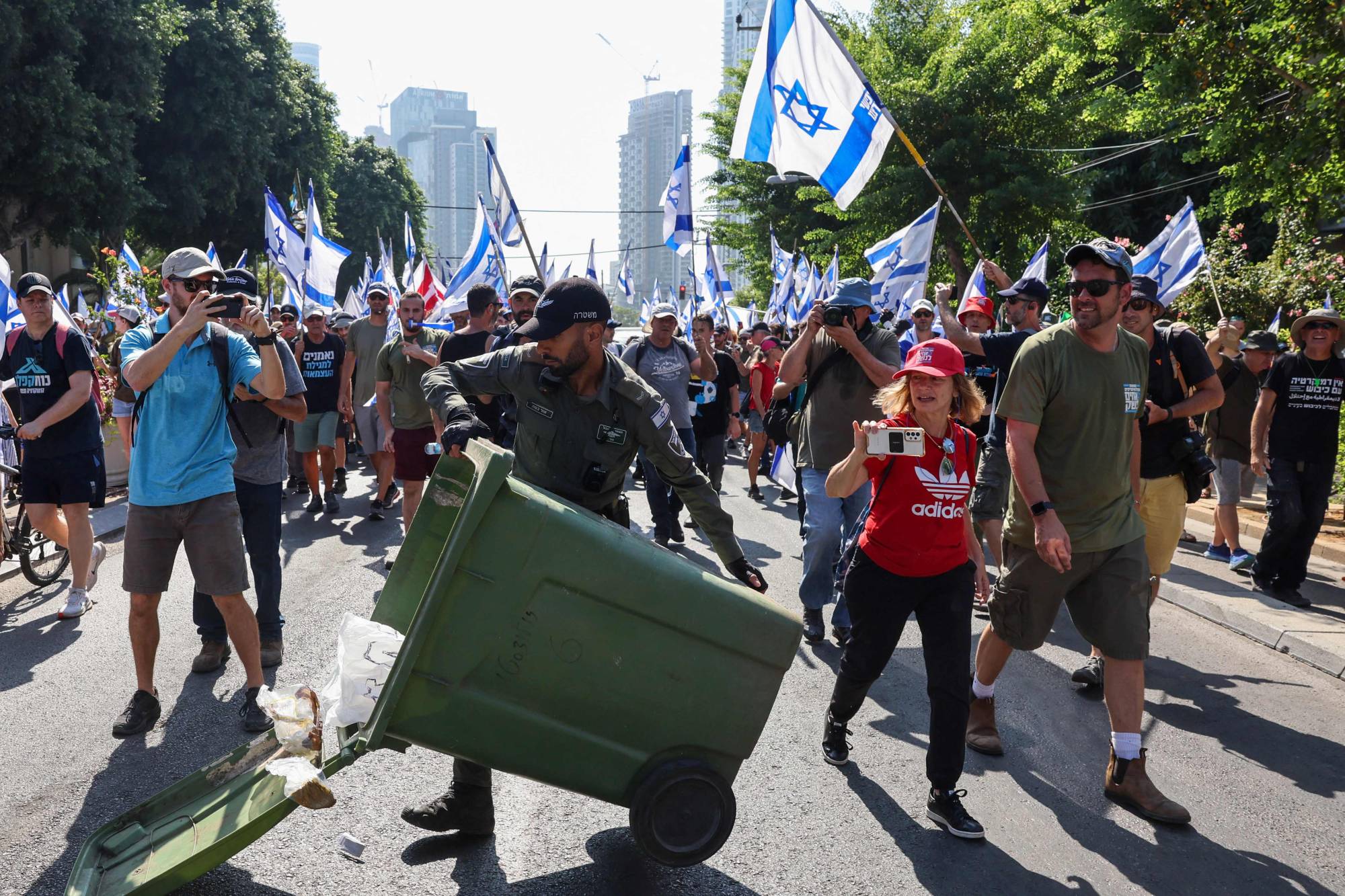 ومنذ الصباح، خرجت حشود من المتظاهرين يحملون أعلاماً إسرائيلية ويهتفون «ديمقراطية، ديمقراطية» إلى الشوارع في تل أبيب، بعدما دعا المنظمون إلى «يوم وطني للمقاومة»، وحثوا أنصارهم على التجمع في محطات القطارات وساحات المدينة وحولها.