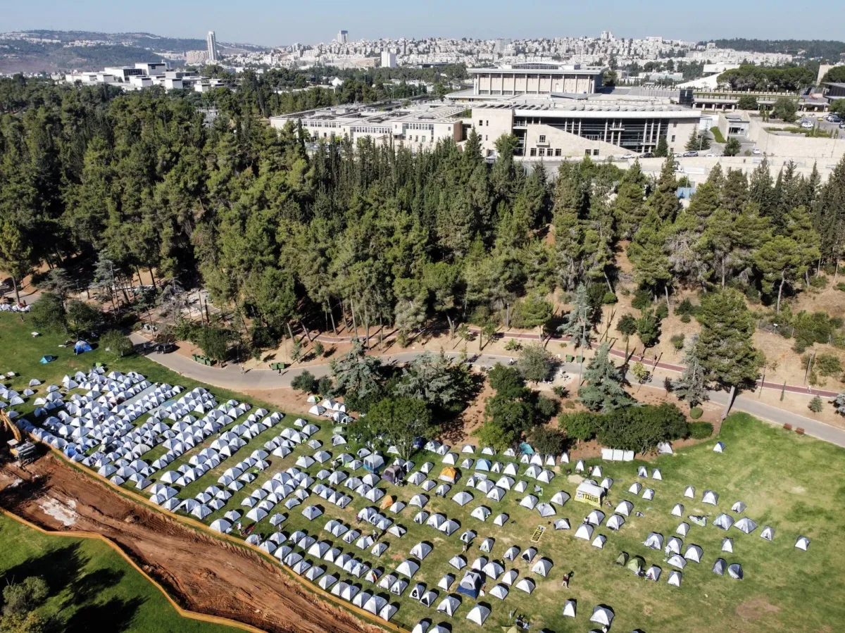 مخيم للمحتجين ضد خطط حكومة نتنياهو قرب مقر الكنيست أمس (إ.ب.أ)