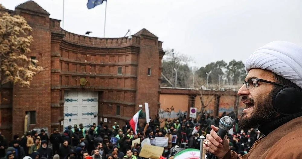 مجموعة من أعضاء «الباسيج» يجتمعون أمام مقر السفارة الفرنسية في طهران يناير الماضي (فارس)