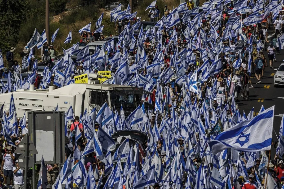 آلاف الإسرائيليين يتظاهرون ضد خطط حكومة رئيس الوزراء بنيامين نتنياهو لإصلاح النظام القضائي (د.ب.أ)