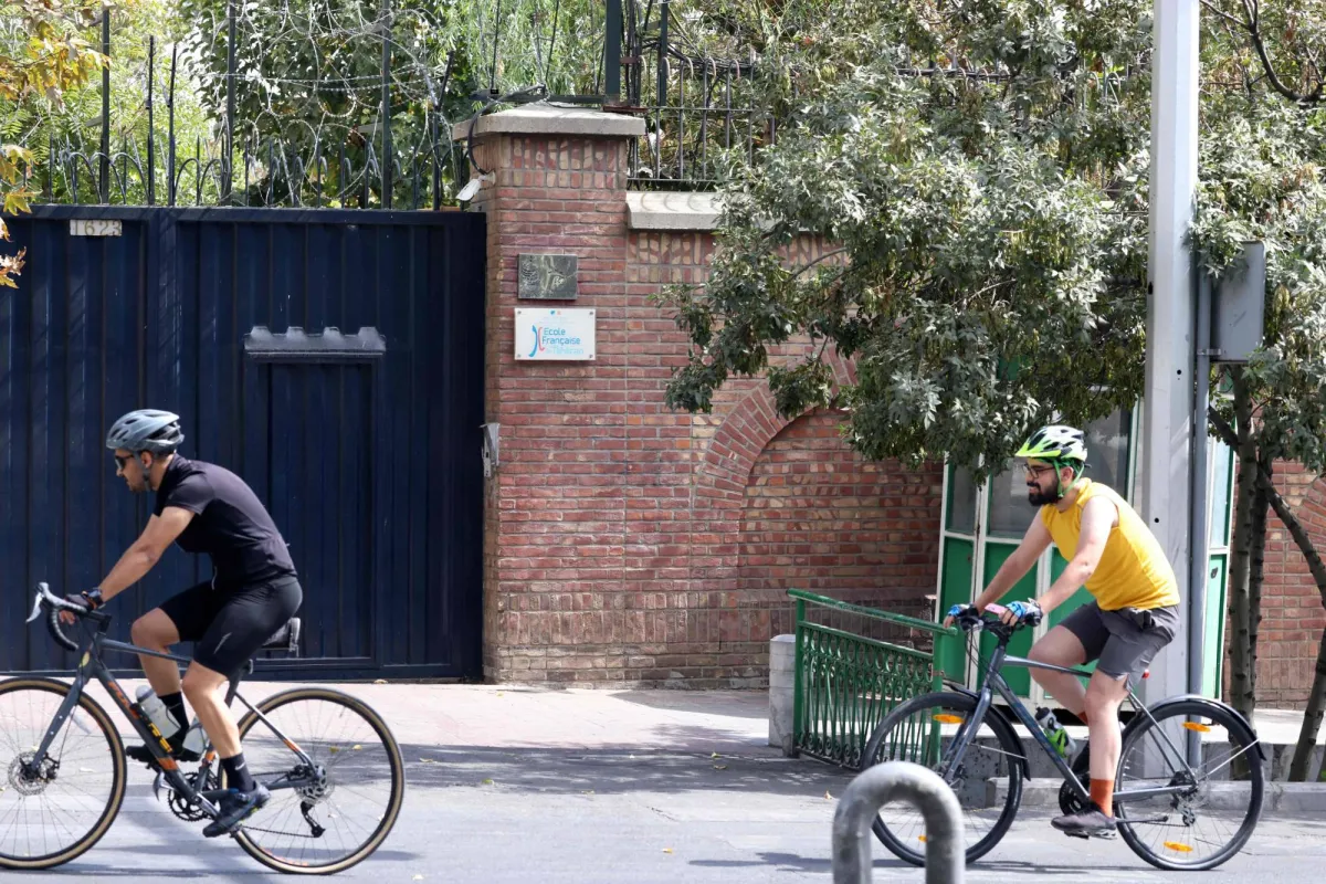 أشخاص يركبون الدراجات أمام المدرسة الفرنسية في شمال طهران 3 أكتوبر 2023 (أ.ف.ب)