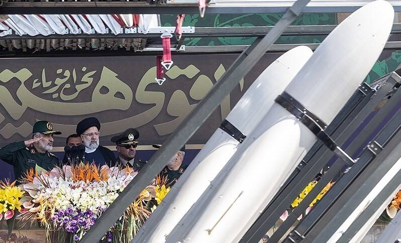 قائد الوحدة الصاروخية في «الحرس الثوري» أمير علي حاجي زاده يتحدث للرئيس إبراهيم رئيسي في أثناء عرض عسكري سابق في طهران (تسنيم)