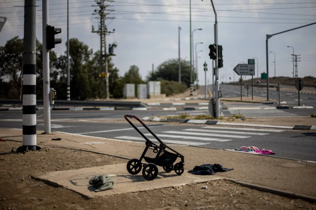 عربة أطفال مهملة وأشياء من الملابس على جانب الطريق بالقرب من سديروت جنوب إسرائيل (إ.ب.أ)