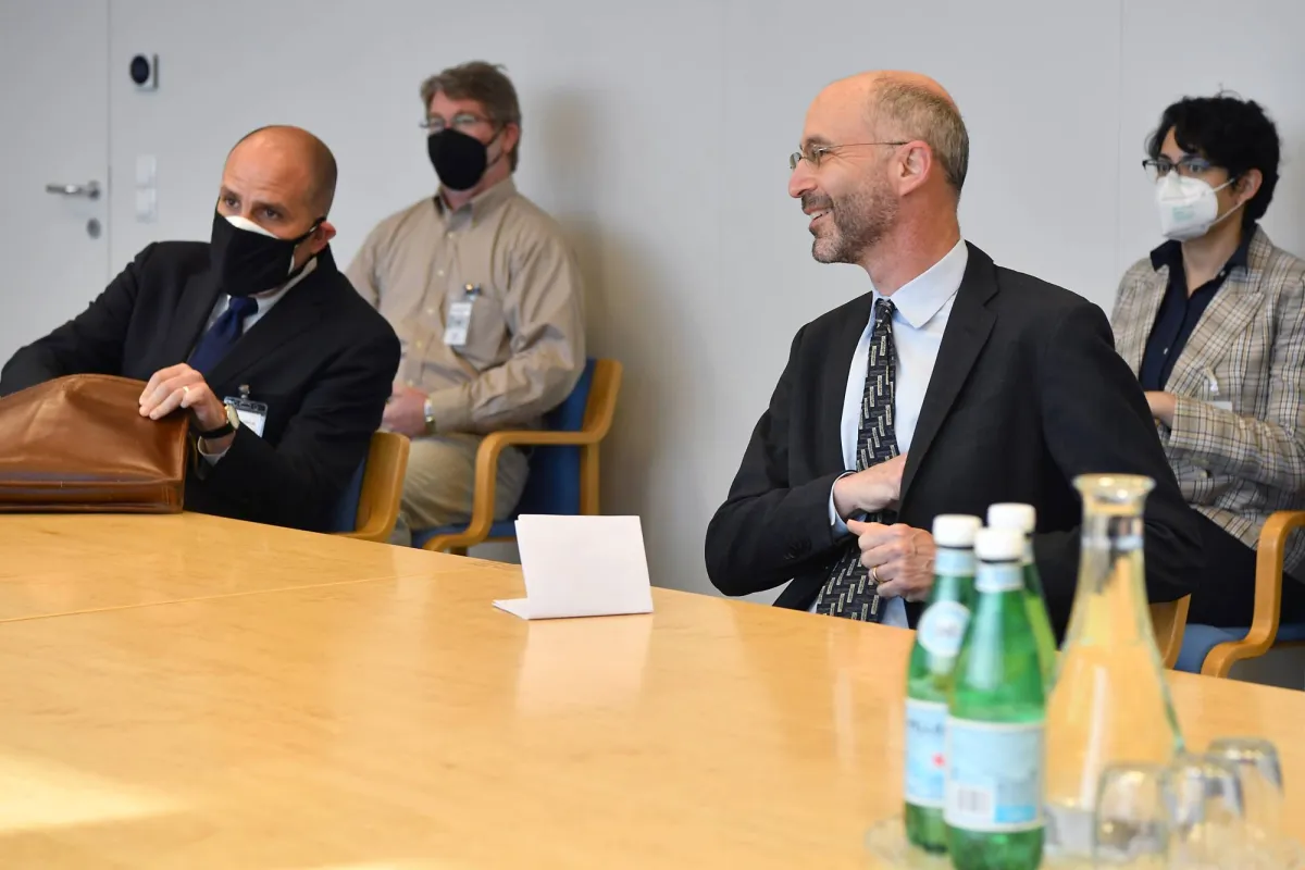 أريان طباطبائي تجلس خلف روب مالي في أحد لقاءاته مع مدير الوكالة الدولية للطاقة الذرية رافائيل غروسي في صيف 2021 (الوكالة الدولية)