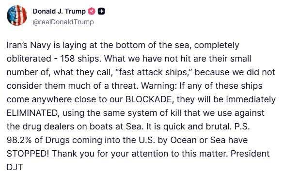 وقال ترمب في منشور على منصة «تروث سوشيال»: «تحذير: اذا اقتربت أي من هذه السفن من حصارنا، فسيتم القضاء عليها فوراً»، في إشارة ضمنية إلى الزوارق الهجومية السريعة التي تحوزها إيران. وذكّر الرئيس الأميركي بأن السفن الأكبر للبحرية الإيرانية «قد تمّ تدميرها». وأشار إلى أن قواته «ستستخدم نظام القتل نفسه الذي اعتمدناه حيال مراكب مهرّبي المخدرات في البحر»، في إشارة للضربات التي كانت واشنطن تنفّذها على قوارب قبالة فنزويلا في أثناء محاصرتها.